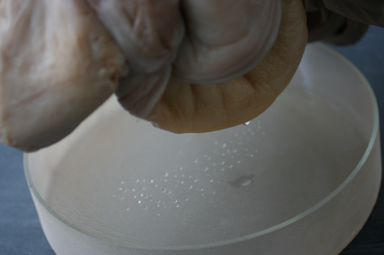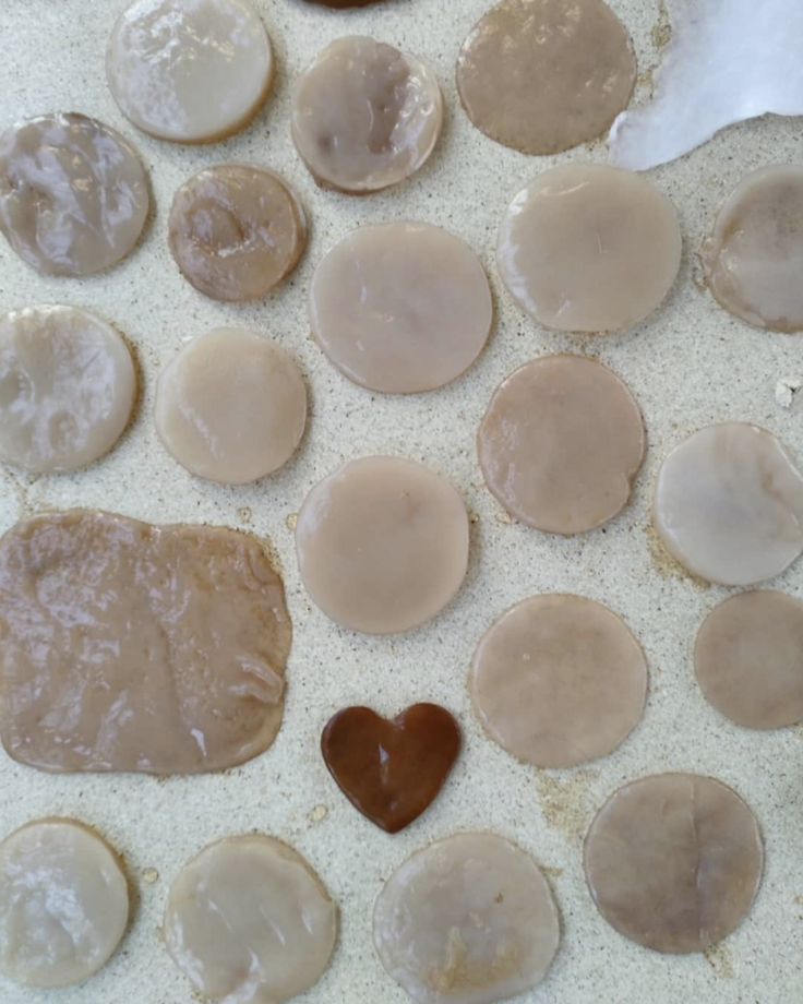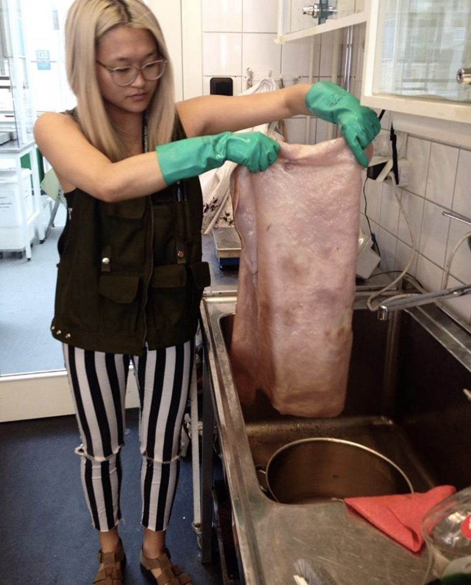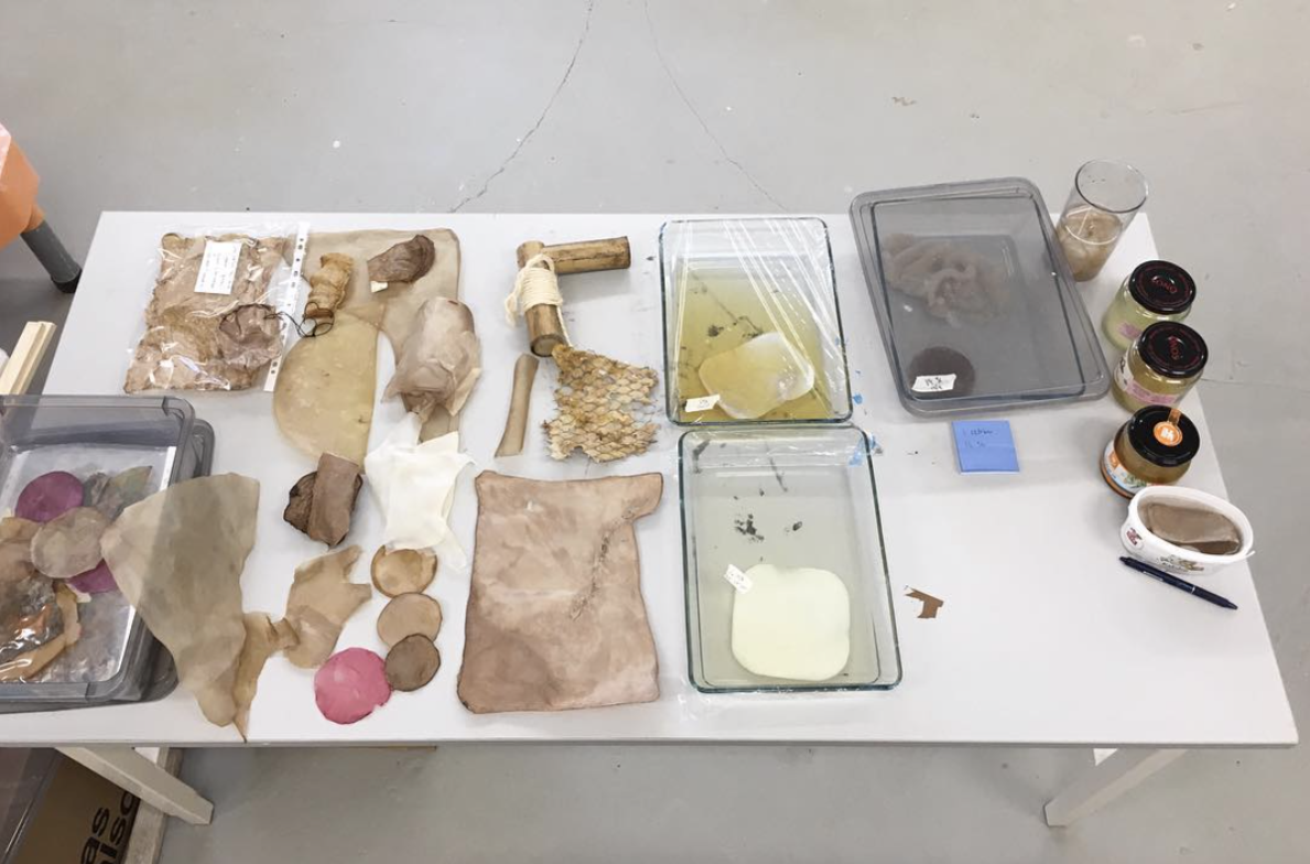 En gång fick jag en kombuchakultur i present av en vän. Tanken på en organism som flöt runt i en glasburk med té väckte mitt intresse men gav mig samtidigt rysningar. Min vän förklarade hur jag skulle sköta kombuchan, och att téet var nyttigt. Vid ett senare tillfälle blev jag blev tipsad om designern Suzanne Lees TED talk ”Grow your own clothes” om alternativ textil.1 Lee nämnde att kombucha har materiella likheter med läder, men till skillnad från läder går det att odla själv. Jag tyckte det lät spännande och kaxigt att opponera sig mot en global industri, och jag blev inspirerad att börja experimentera med min kombucha hemma i köket. I mina efterforskningar om kombuchans ursprung fann jag att den härstammade från Kina och ibland kallas för Livets Elixir.2 Detta fann jag spännande. Sommaren 2017 importerade jag en ny kombuchakultur från Kina som jag därefter skött och kultiverat. Mina odlingar kräver rikligt med näring, och jag matar dem med té och socker, annars växer det inte. Varje odling får sitt unika uttryck genom exempelvis färgvariationer från en gång till en annan. Det är fascinerande att se någonting växa ur till synes ingenting. Min metod låter mig vara självständig och fri – jag har kontroll över mitt hantverk genom kunskap.