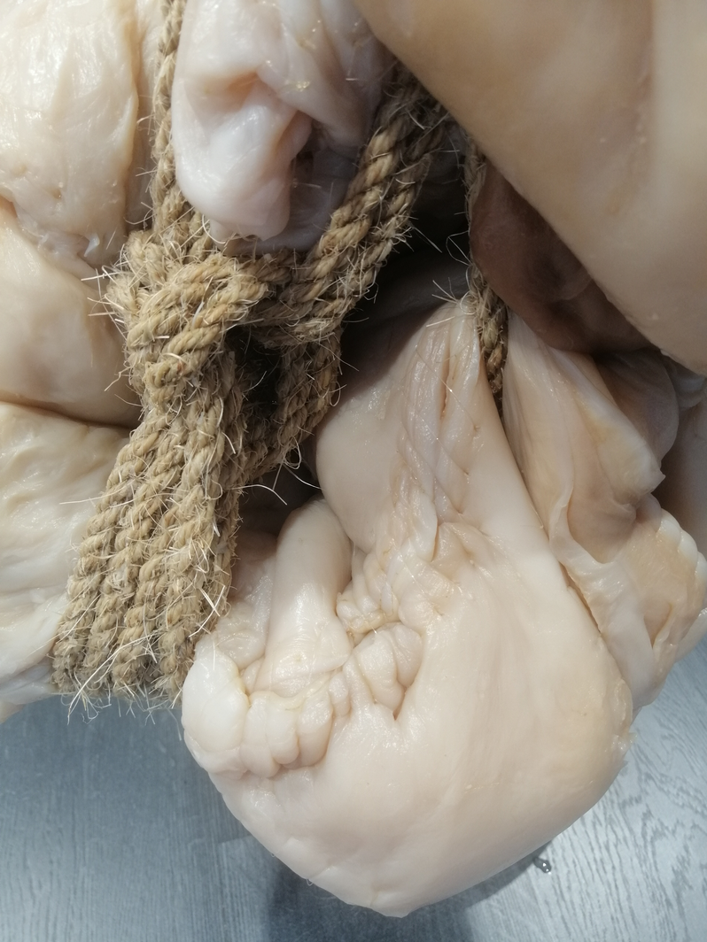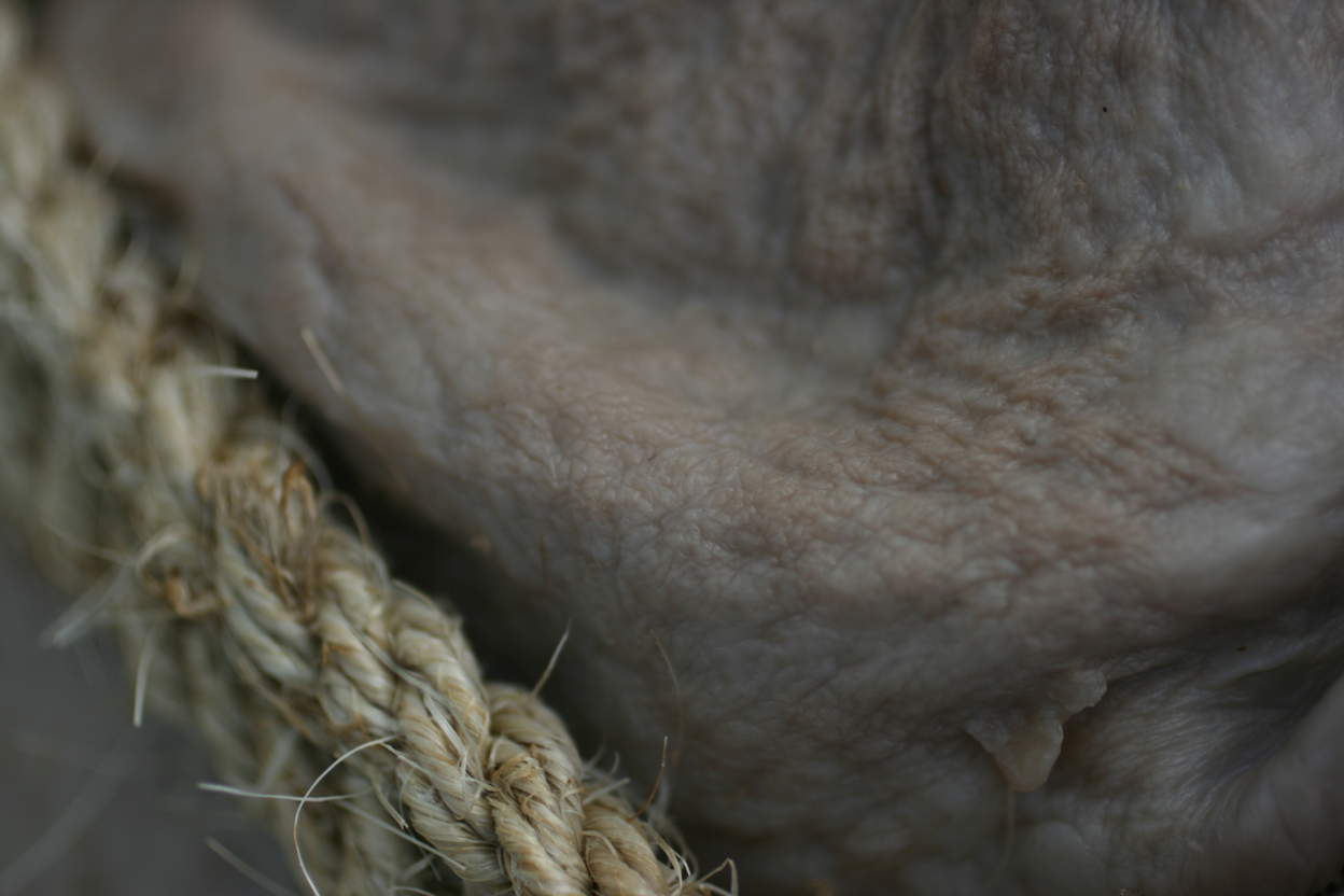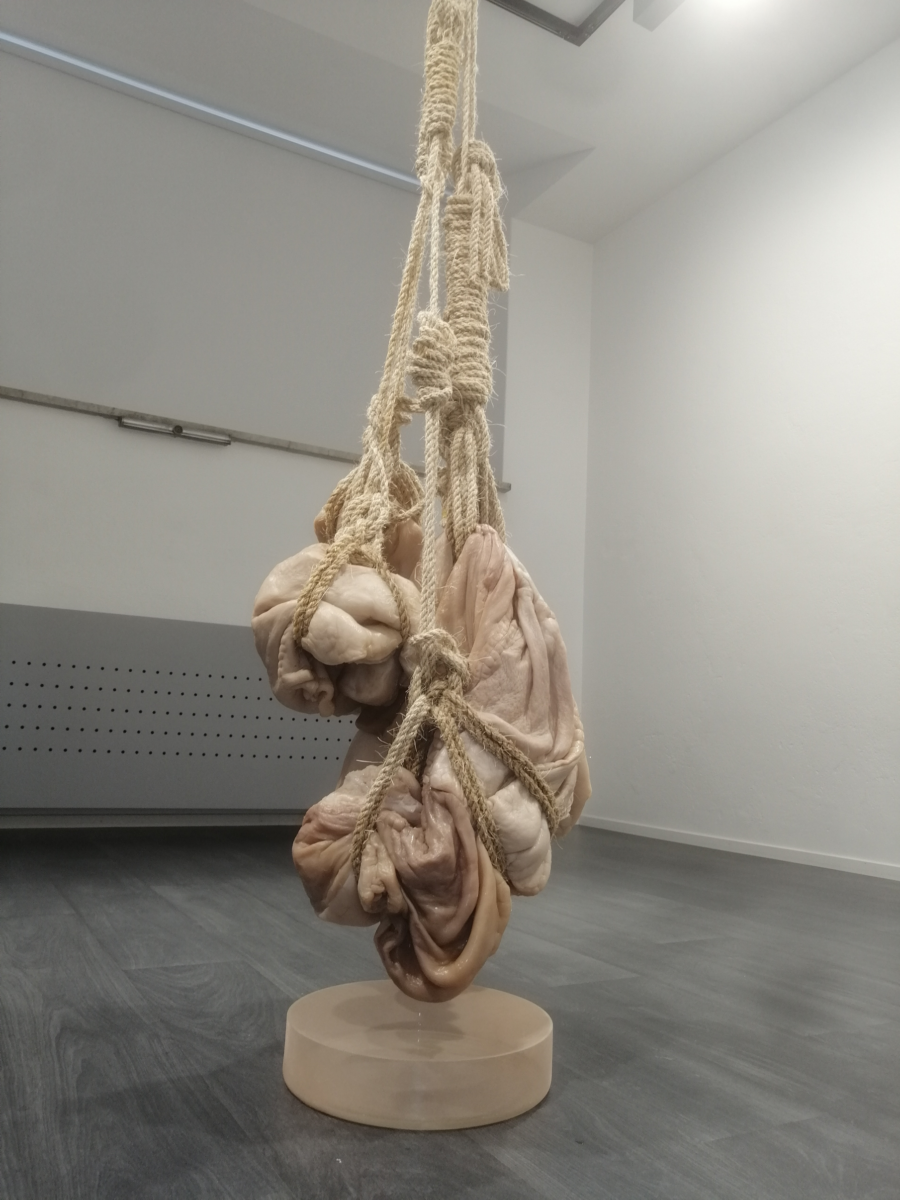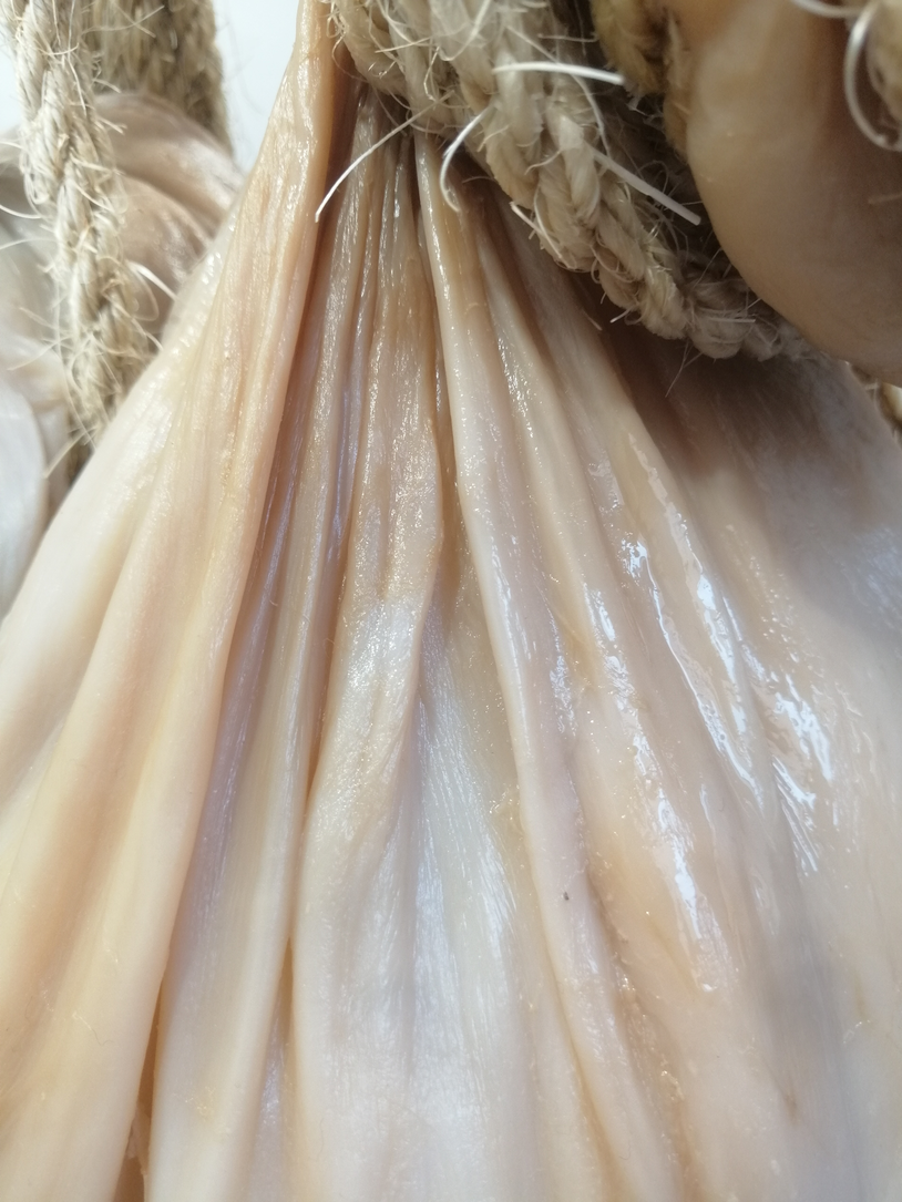 En veckan efter öppningen/vernissagen. Verket har börjat förändras och vattnet avdunstar från kroppen. Ytor går från att vara puffiga babykroppar till att likna gammal hud.