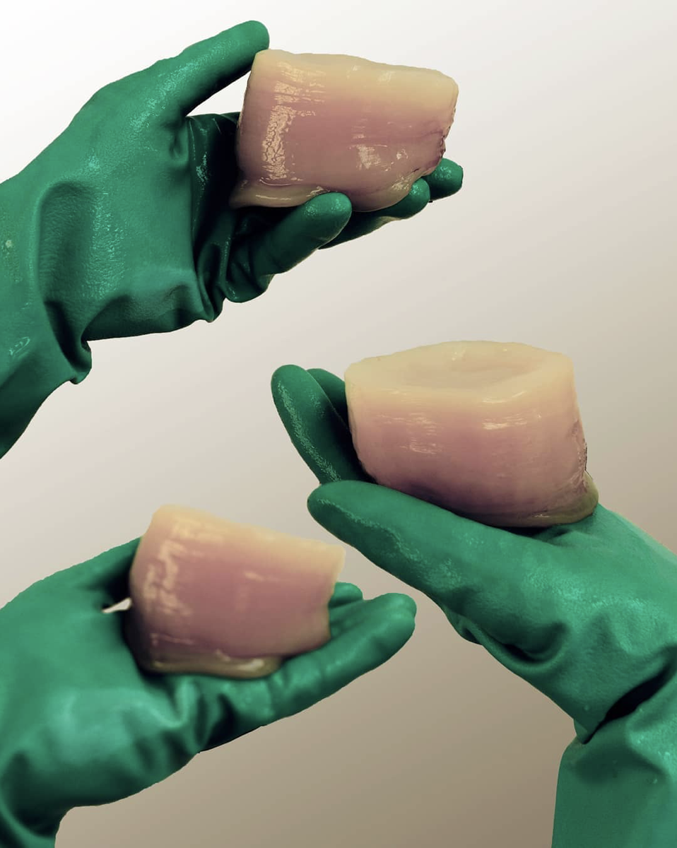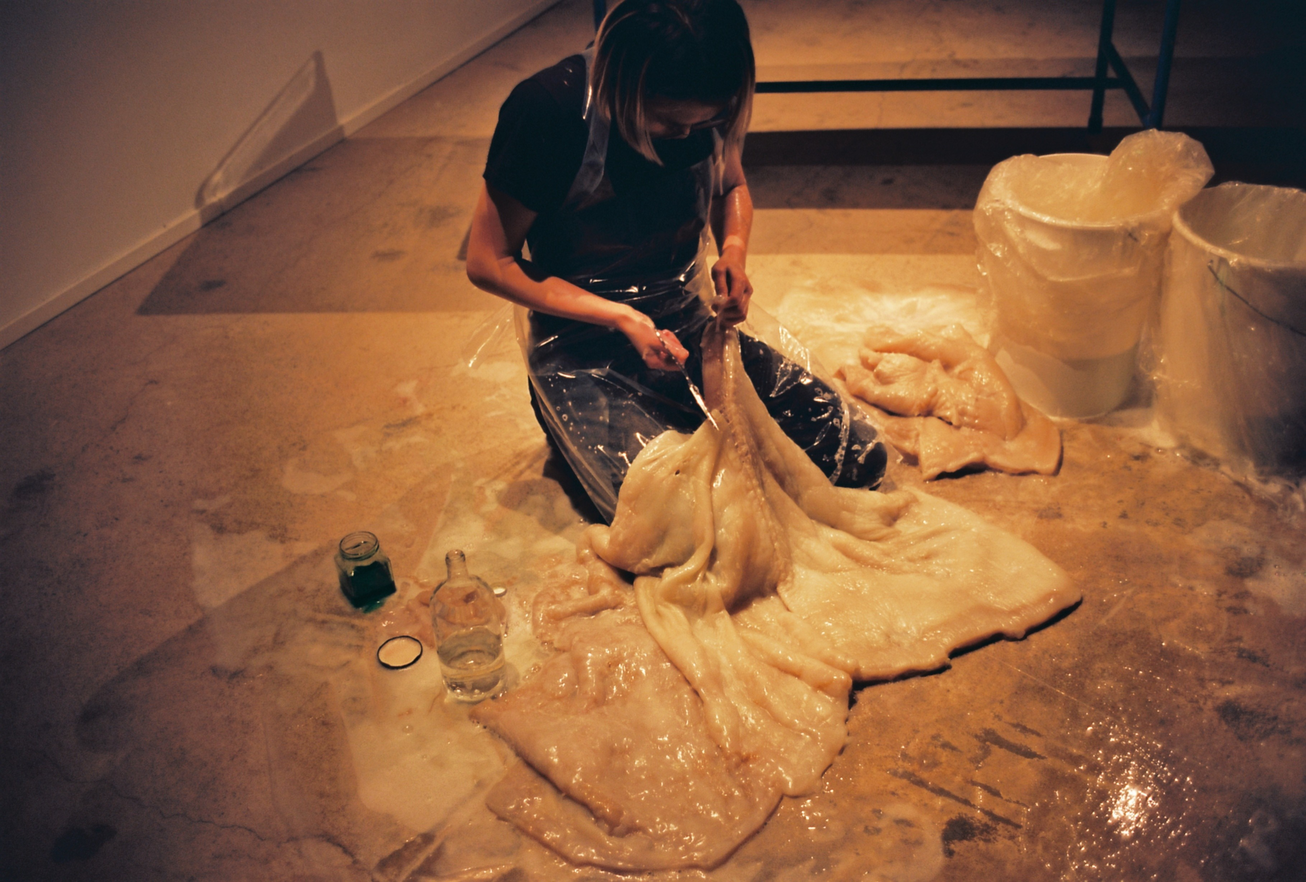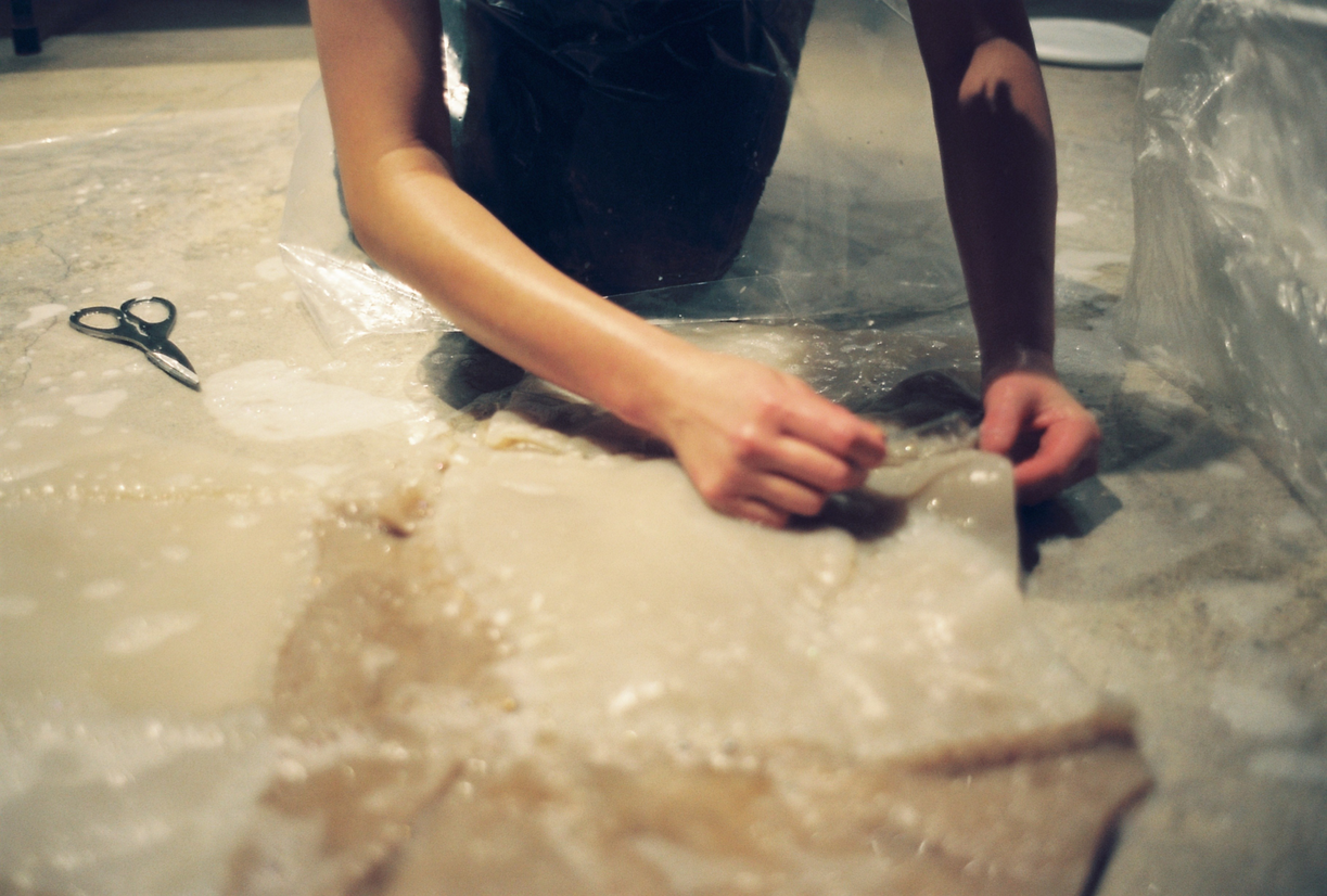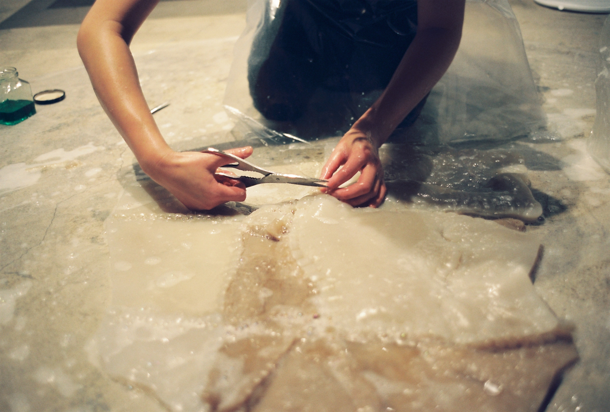 Jag har under några år lärt känna materialet väl – jag vet hur det beter sig, vad som fungerar och vad som inte fungerar. Att få kombuchakulturen att växa kräver kunskap och tålamod, precis som det gör med barn. Tillsammans har jag och kombuchakulturen utvecklat ett förhållande som blir en metafor för adoption, där jag agerar förälder.
