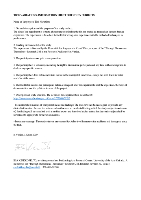 Appendix: Informed consent, as formulated according to the regulations of UNIARTS Helsinki.