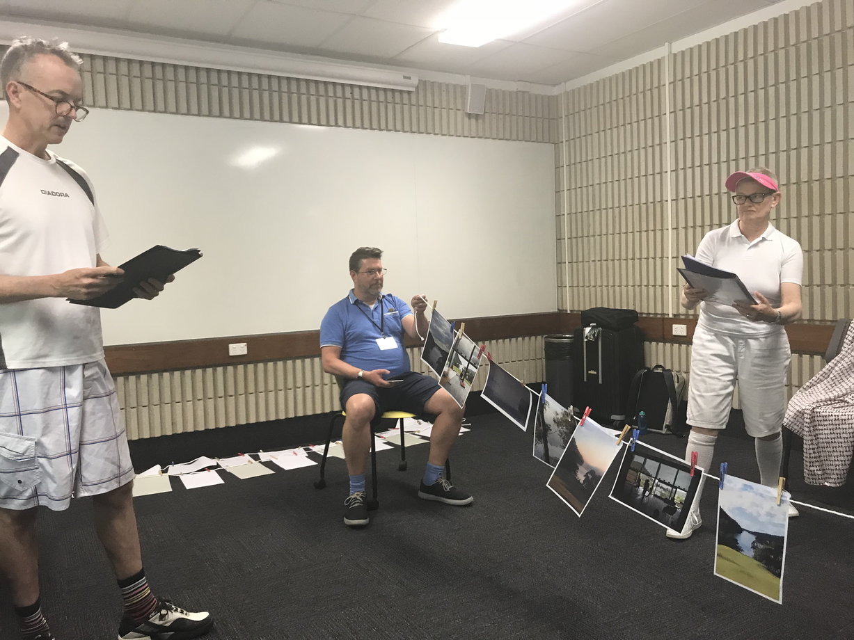 CATH AND JOSHUA TURN THEIR STRING OF PHOTOS SIDEWAYS TO FORM A ‘NET’ FOR PETA AND DAVID’S SECOND GAME. PETA AND DAVID ADD FURTHER RIDICULOUS ITEMS OF CLOTHING TO THEIR ATTIRE. THEY STAND AND FACE EACH OTHER, ‘SCRIPTS’ IN HAND.