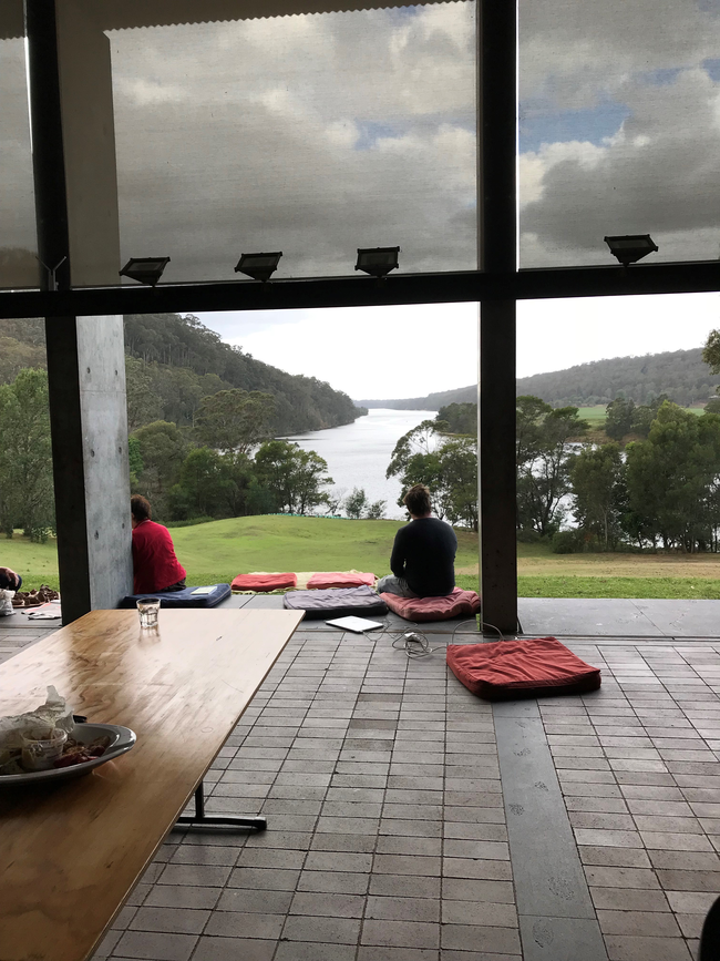 CM: Every morning we gather in the large room, an empty space to discuss art, climate change, the world around us.  Arthur Boyd’s painting Hanging Rock and Bathers (1985) hangs at one end. There is a piano, and tucked away in one corner, cushions, chairs and tables. A massive sliding glass door takes up one side of the room, the side that faces the river. It’s possible to peel back the wall entirely, to see the whole view. We’re inside and outside. It is the river and sky that fills this place, the bird chatter, kangaroo gazes, and wombat trails.
