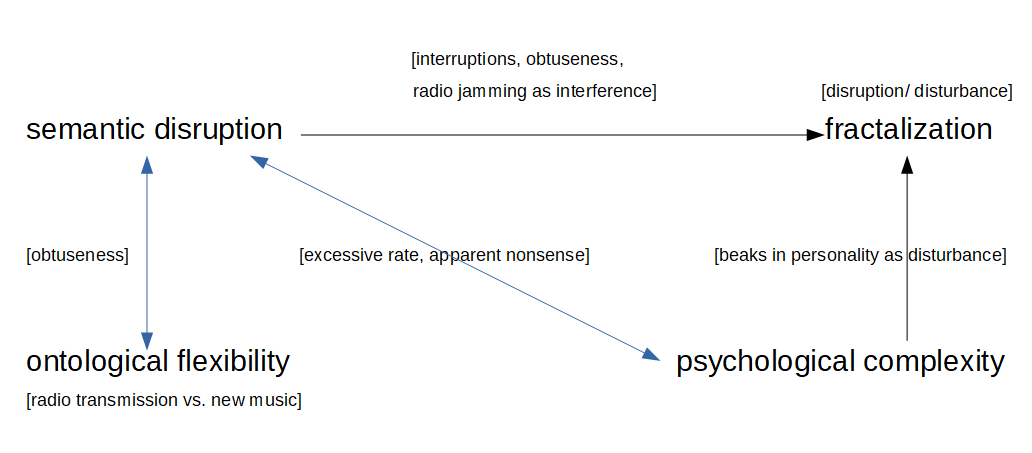 Finally, Never is Once is also ontologically flexible. One possible ontology, apart from the surface level interpretation of the work as a piece of new music, is that the piece as a whole is a radio transmission; if the sections of solo electronics are jamming signals, then everything else is what is being jammed. These two incompatible ontologies coexist; as in Persona there is a certain impossibility. It is unclear what the “reality” of the piece is, and the irreducible contradiction at the core of the piece’s conception forces a disruptive feeling into existence. This feeling in turn is a manifestation of the self-similar disturbance of identities in the piece. The character-performers arise out of contradiction, out of precariously balanced and fractured personalities, who are non-characterized performers, Tudor figures, self-aware Sibyls with near-automatic intuitions of the piece-qua-piece and impersonal catalysts of the destruction of meaning. A general scheme of the piece is shown in Fig. 4.