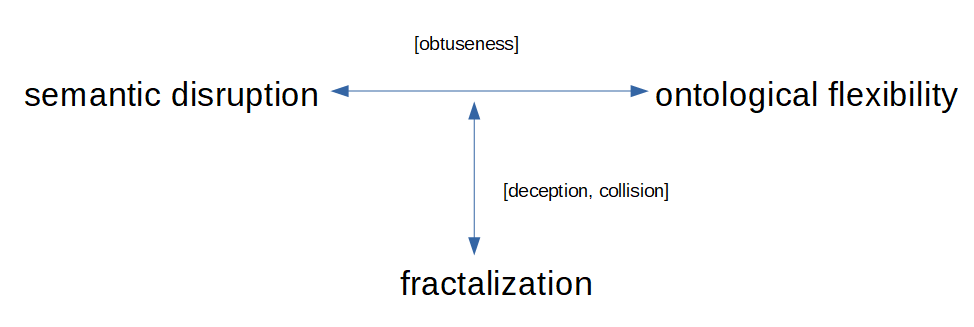 I can’t truly say with certainty that the fractal dimension is objectively existent in Pale Fire. It seems almost an accident of my reading. The suggestion of dimensions, which are self-similar and meet tangentially at the points of suggestion, appears like a punctum, an unintentional semantic disturbance. The potential for a fractal reading strikes me with its emergence and pricks me in a blunt way, but I have a hard time resolving whether Nabokov intended such a break in my expectations for a linear semantic flow, a break with the typical dimensions of meaning for a “novel of this type,” or whether the emergence of this potential really is an affective accident as in Barthes’ photographs. When reading Pale Fire, it seems at least as probable that this partially veiled suggestion of self-similarity is the result of my (perhaps over-) active perception, that I am reading too much into it and being seduced by the comfort of over-simplification. What is obtuse in Pale Fire is not what is “meant,” but the mechanism of meaning itself. It thus appears that if the device of obtuse self-similarity is indeed part of Nabokov’s design, then the fractal deception that we have examined runs to the very heart of the work’s problematics of meaning. This is shown in Fig. 2; the alternate ontology (fractal structure of deceptions and collisions) is suggested obtusely, in veiled suggestion rather than articulated semantic clarity.