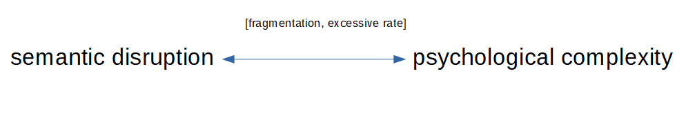 When witnessing Not I, then, much of what affects us, what we absorb, contributes to this overfull-ness and is registered by the autonomic nervous system before we can assign any meaning to it. As with other works of Beckett, the use of language is intentionally depleted of its typical semantic-communicative function. Not I communicates in immediacy, in potential, and the down-playing of semantics by the combined use of a speed that outruns the listener’s capability to construct semantic sense, fragmentation and non-linguistic gestures such as laughter and facial expressions. In Massumi’s language, this order of things allows affect to resonate, whereas more conventional use of grammatical language would necessarily dampen affect, by suppressing its autonomous potential. Fig. 1 illustrates the interconnectedness of semantic disrupton and psychological complexity in Not I. The psychological dimension of trauma is facilitated by the use of elements that disrupt linguistic sense, and these disruptions are likewise used to communicate the psychological complexity of the work.