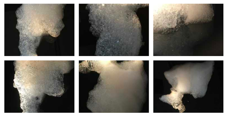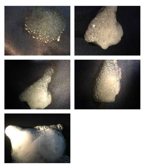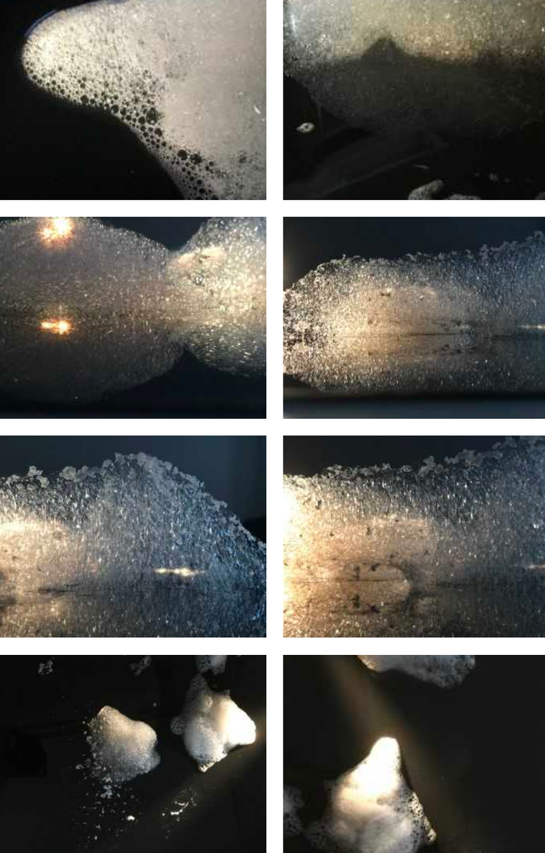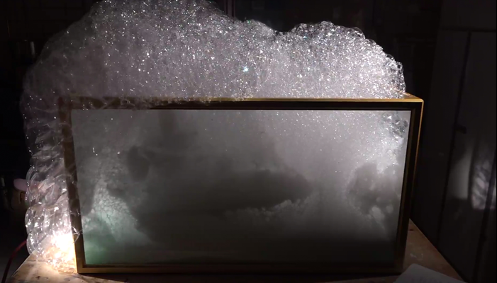 FOAM'S ANATOMY. The foam laboratory focused in its first phase to foam’s anatomy by way of micro-scale (analogical and digital) explorations of foamy existencies by setting up and archieving micro and small scale observations, reflections and documentations. The experiments were made in collaboration with Paul Cegys, and our roles were differentiated into "the analogical-material one" and "the digital-virtual one". I produced and collected the "analogical samples", photographed and video-shot the documentation in and out of the aquarium, filled with foam (made out of various combinations of water, dishwashing detergent, glycerol and sugar), and tested different modes of presenting an anatomy of foams – on dark silk, on plexiglass, and as collection of archaeological treasures. Paul produced and collected the "digital samples", focusing on the immersive cinematic experiments e.g. by the use of 360-dergee camera (fly and other video shooting gear) that enables a cinematic staging of "being-in foam-space".
