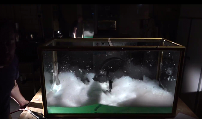 The aquarium was filled with soap and water, enough to produce an aquarium-full of foam with using compressed air through a pipe. The gathering became a contemplative moment, at times almost mediative, as the intense focusing on the foam as it was "made" and as it started after a while to transform as it gradually grew smaller – "died". The foaming exercises proved performative as itself, and the intensity of performativity became hightened as we arranged reading-out-loud sessions – readings of chapters of Sloterdijk's Foams edition by the aquarium. The staging opened unexpectedly effective scenes of group-thinking.