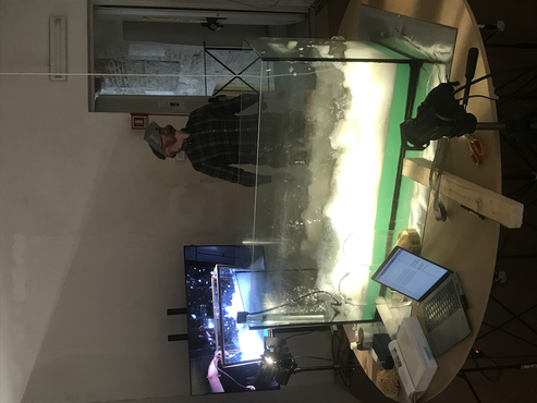 The installation consisted of a large AQUARIUM on a ROUND TABLE as the centerpiece. Around the table there were small stools to enable gathering by the aquarium.