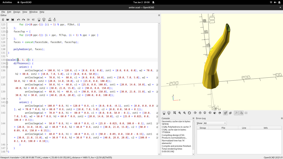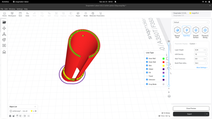 First design of an antler made of a number of segments in OpenSCAD. The segments can then be separately printed, and one has to find a way to attach them. For now, I'm printing some inlays for the piezos, and connecting pieces which are glued, then screwed.