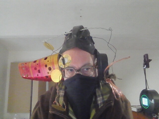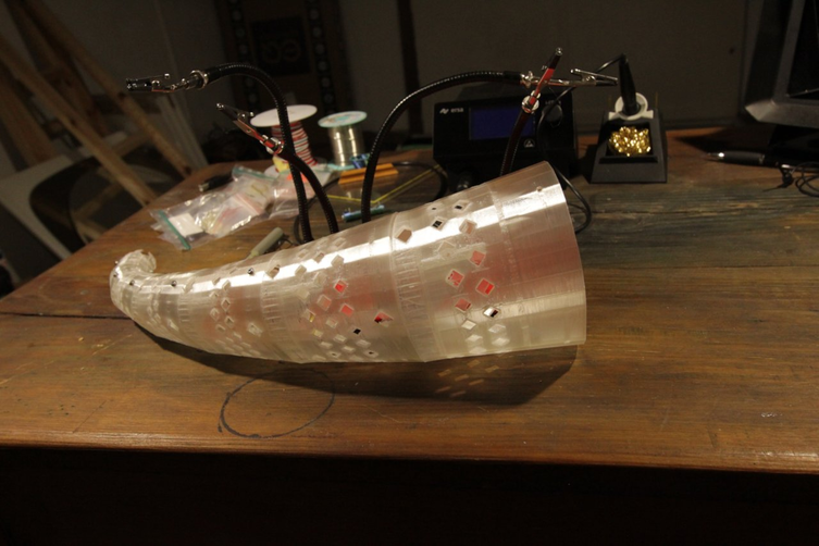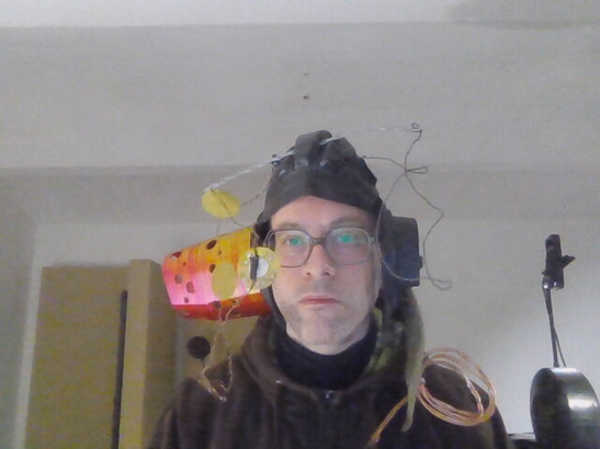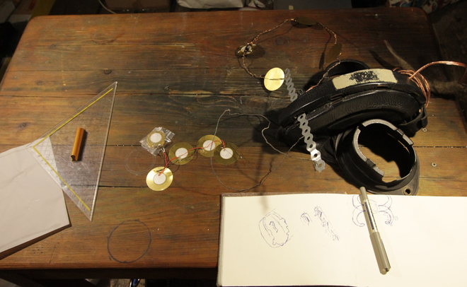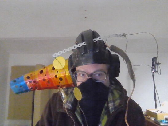 I'm thinking that there will be two more leads through the horn; one for an LDR sensor, and one for the microphone. I found a hopefully flat enough microphone cable that will arrive soon. The LDR could be used to guide the balance between the piezos. I'm now thinking that since the sound is so faint, I will pair them only in two parallely wired groups—an inner and an outer group, requiring thus one mechanical relay per horn, or three relays for the entire person. I think the microphones should have a kind of parabolic dish attached to them, focusing their otherwise omnidirectional pickup pattern. Perhaps one of the “double horn" on one side could be spiralled back towards the person's face, thus allowing them to speak or whisper.