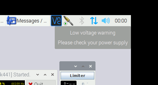 Subsequent test with the power bank and all three loads connected: Pi 3B on the 5V output, Rubix44 on the 9V output (attention has to be given to the reverse polarity that the Roland uses), with one OM1 connected and phantom powered, and the Auna amp on the 12V output. Directly connecting the line signal creates a horrible noise, but inserting the Aukey anti-hum transformer works as always. Today I don't see undercurrent warnings on the Pi, which may be due to a better USB cable, or due to the fact that I chose a different Pi (with a different software image).
