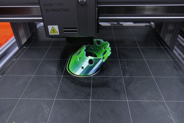 Having built the first horn based on a slightly flawed 3D model (requiring glue between segments and placing the piezos in an angle that makes it difficult to fasten and wire them, difficulty in fixing the screws between segments), printed with remainders of duo-coloured filament, a was able to create a second model that is much better constructed. Each segment is now fastened to the next using three screws, and there are conducts that allow to fasten the screws from the sides. The new horn is very stable, and I began testing the piezos. As of this writing, I attached the three larger piezos towards the ear side. Their sound is a bit disappointing at first, since they are not are attached to any conductive surfaces, by themselves they are very narrow banded in the high frequencies. But I don't want to give up on them and flip them for small coil-based speakers or transducers, I still like their flatness and their brass appearance. Perhaps in a future version, they can be attached to vibrating surfaces, thin ceramic, glass or metal inlays. For now, I want to continue and see if I can make an interesting piece that relies on this faint high frequency sound. The paired and iron-wire-wrapped copper leads to the piezos look great, the only worry is that their stiffness can exert pressure on the piezos themselves when mounting, risking to break off the piezo; and it's still unclear if it will be feasible to thread them from the outer segments all the way to the horn's base.