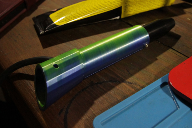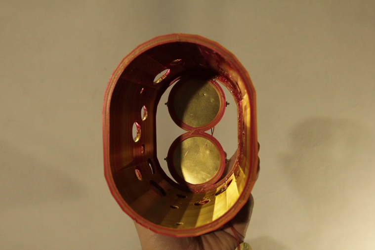 View of first segment from perspective of the ear, showing two brass discs of the piezos.