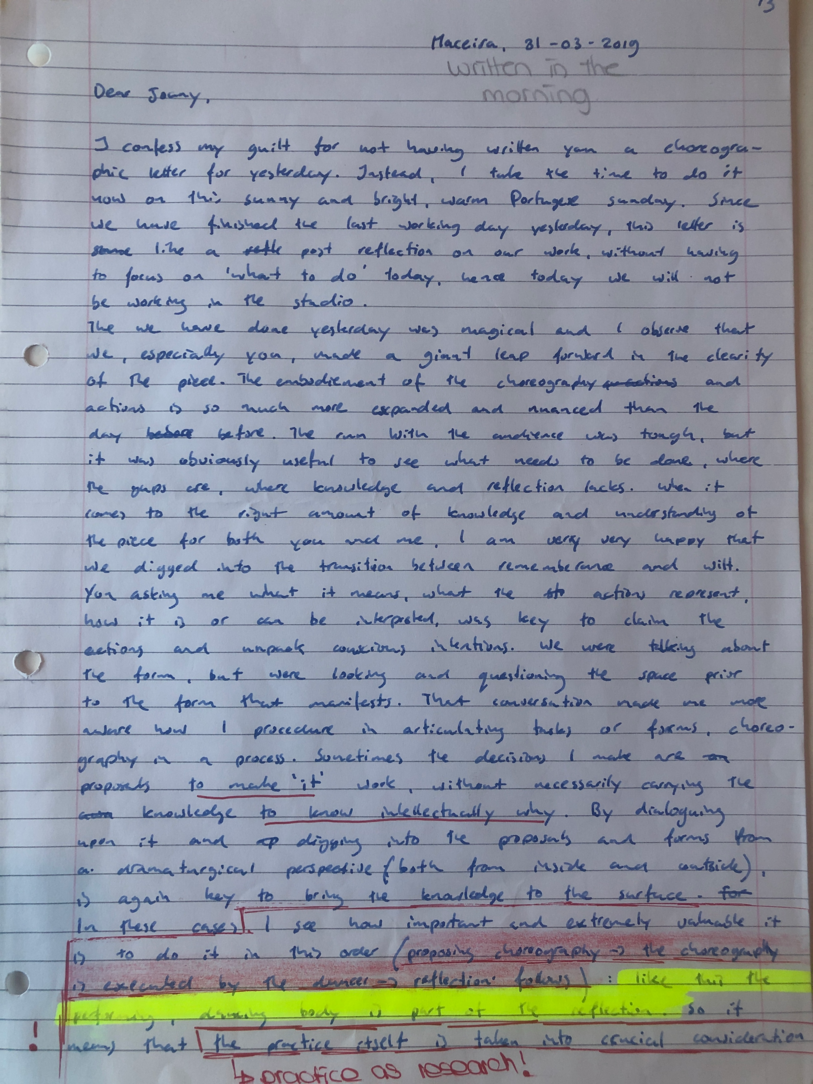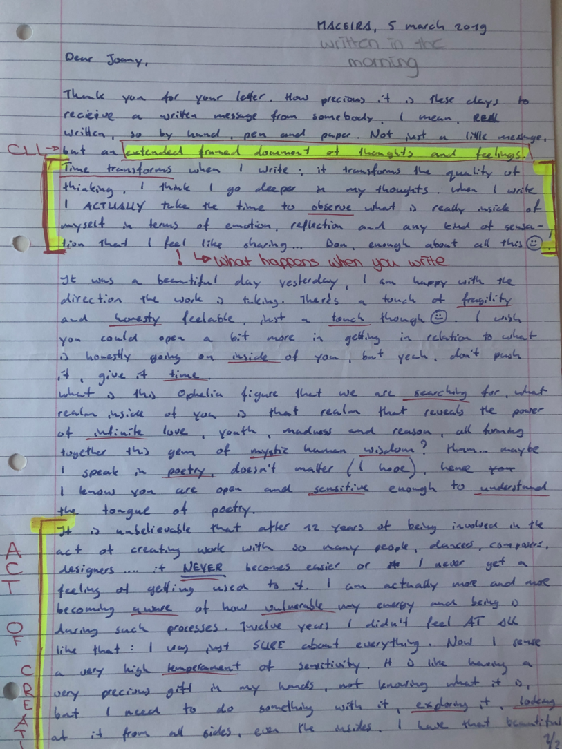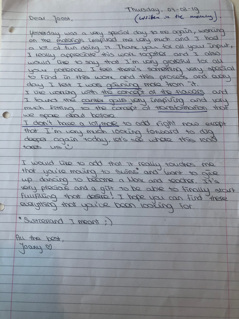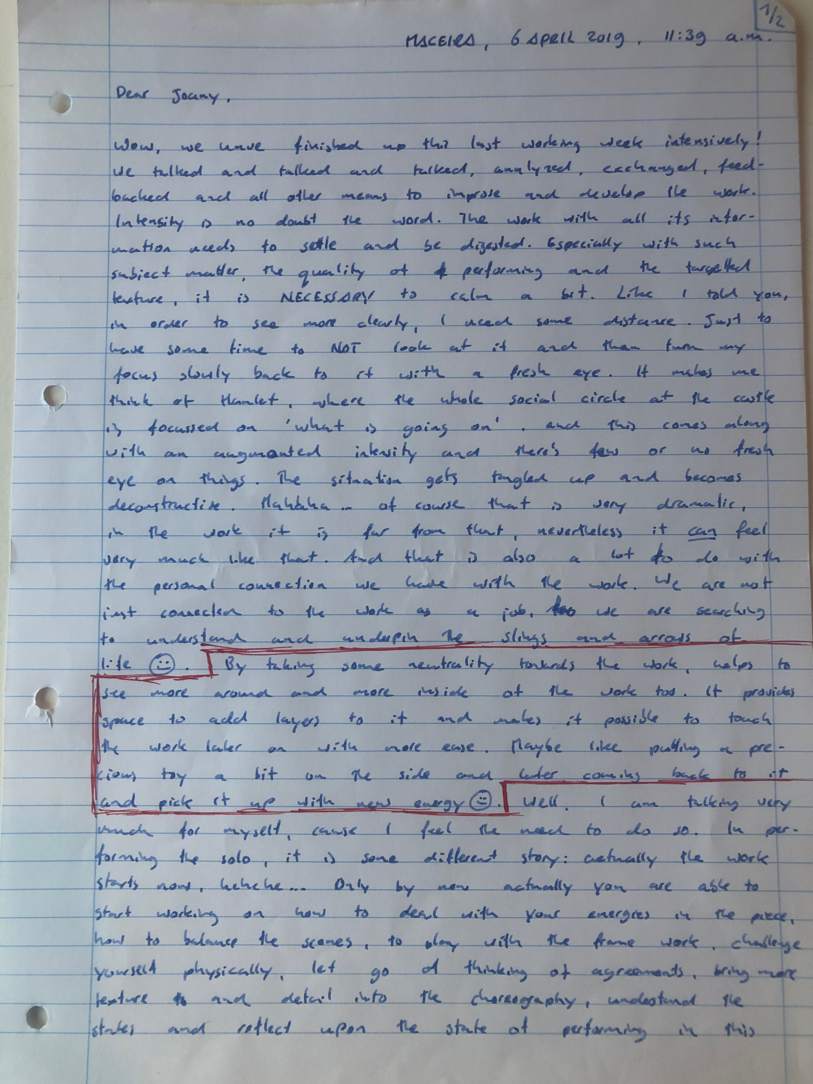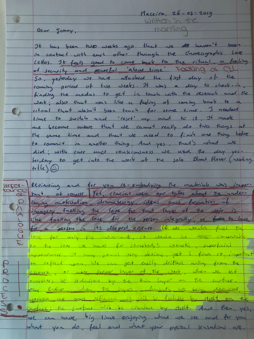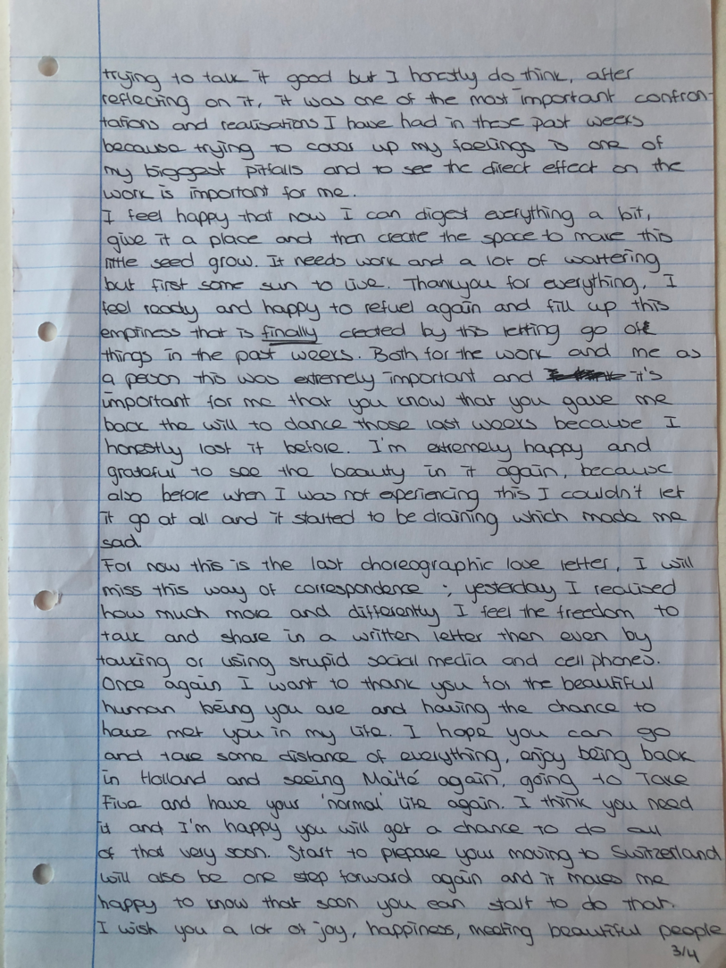 Choreographic Love letters is a method which I coined as an alternative, creative way of correspondence which supports the flow of thinking during the process, in between the rehearsals. The writing is done in a way to reflect upon what has been done during the rehearsals, sharing the thoughts of the studio moments and forwarding thoughts that feed into the coming rehearsals afterwards. Choreographic Love Letters is a form of continuous dialogue between the creatives involved in the process by hand-written letters.