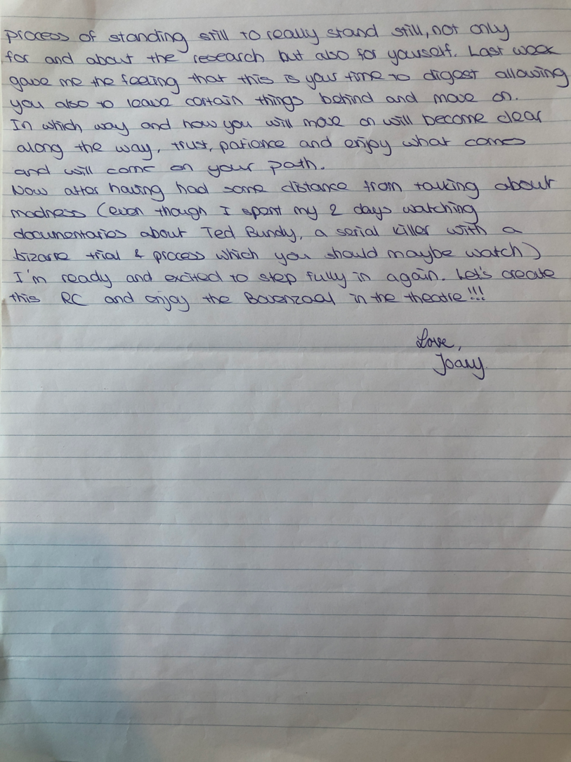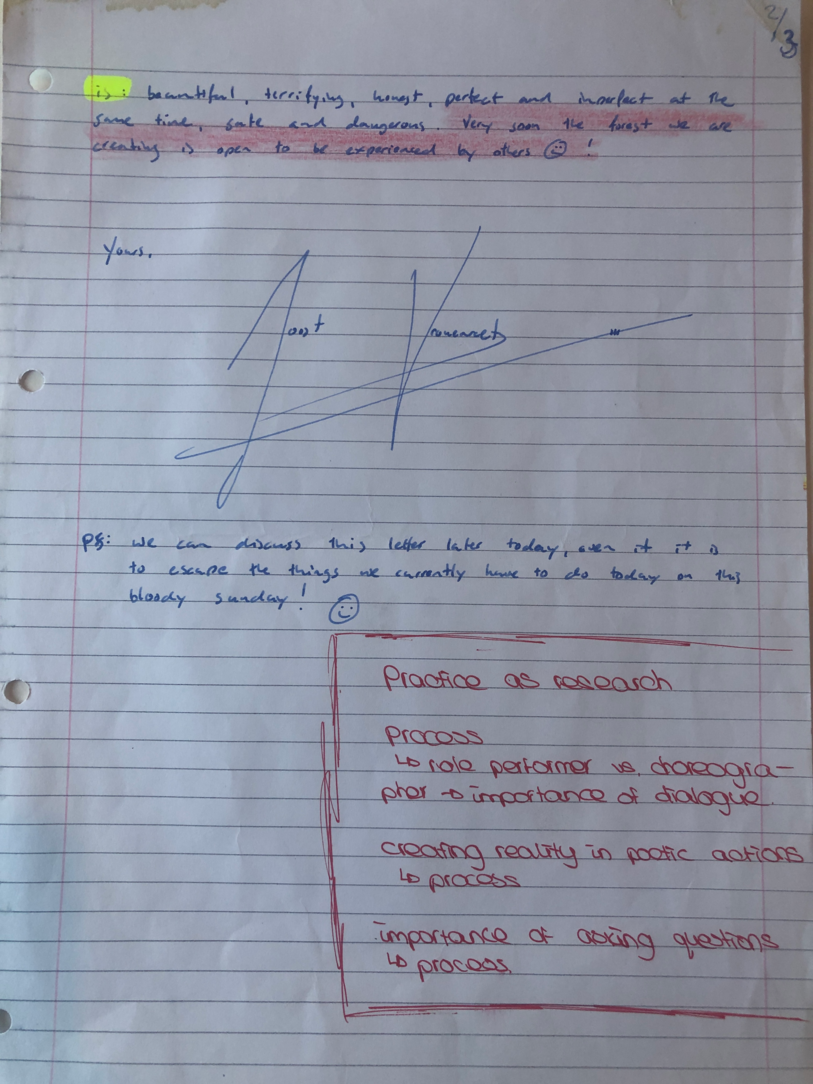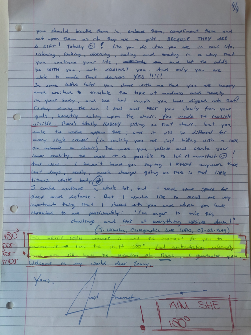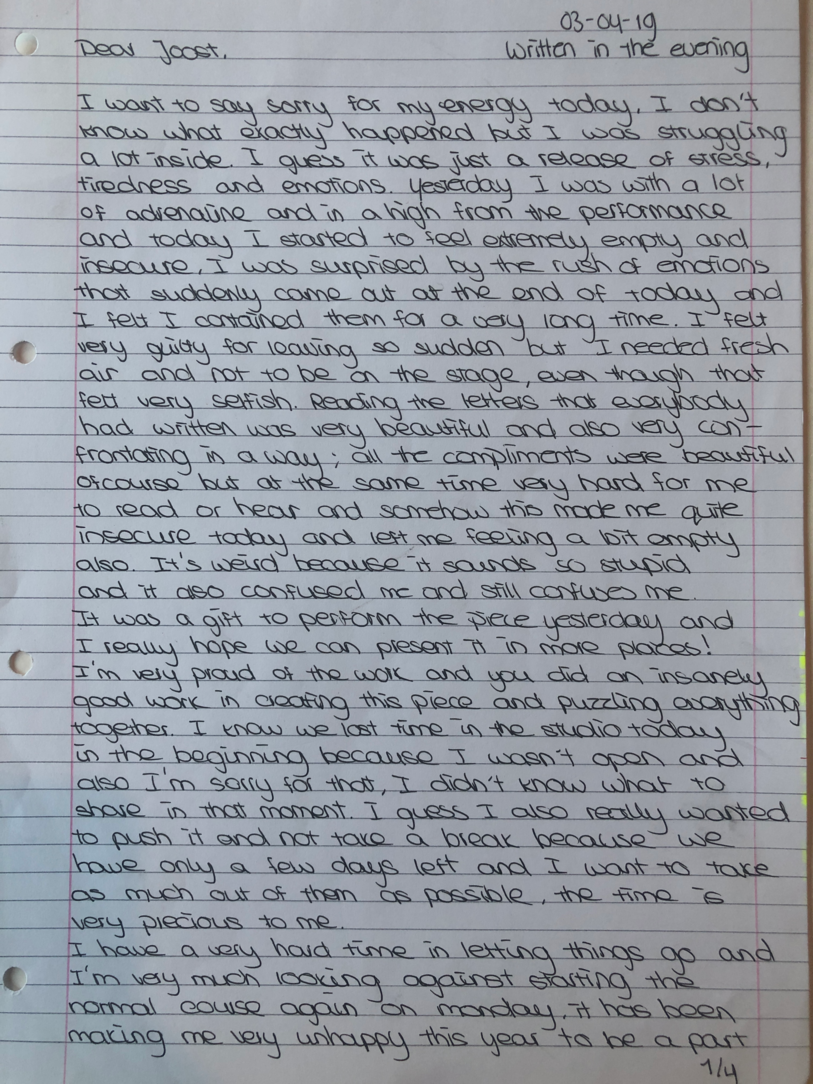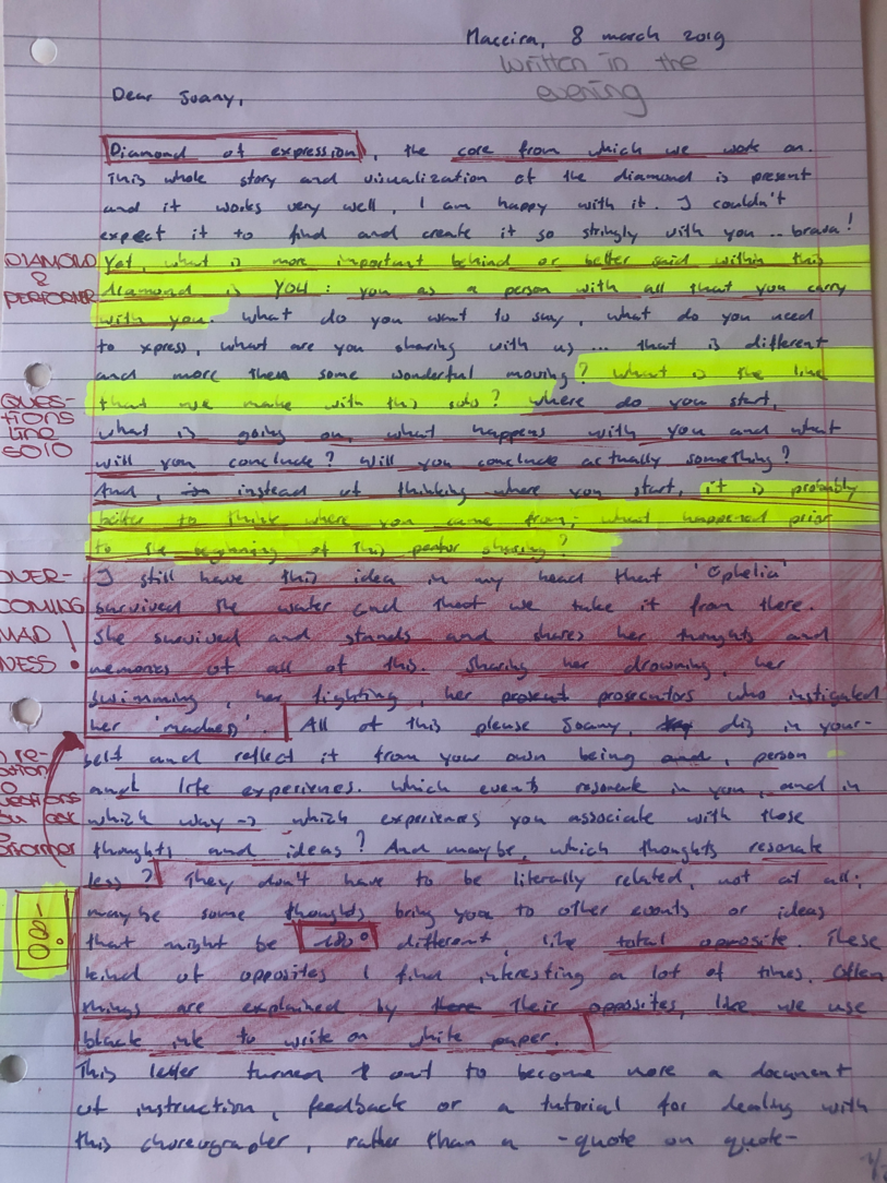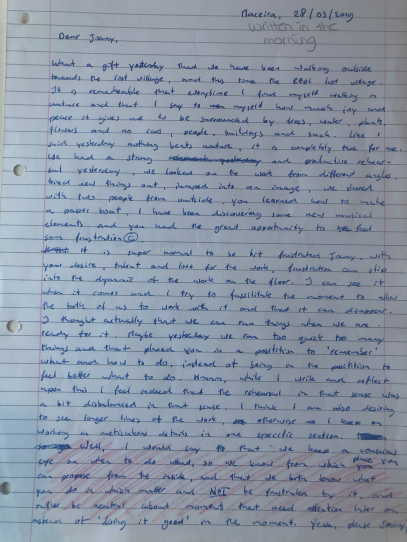 Choreographic Love letters is a method which I coined as an alternative, creative way of correspondence which supports the flow of thinking during the process, in between the rehearsals. The writing is done in a way to reflect upon what has been done during the rehearsals, sharing the thoughts of the studio moments and forwarding thoughts that feed into the coming rehearsals afterwards. Choreographic Love Letters is a form of continuous dialogue between the creatives involved in the process by hand-written letters.