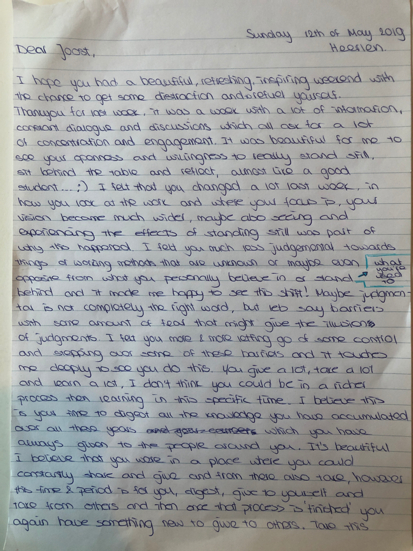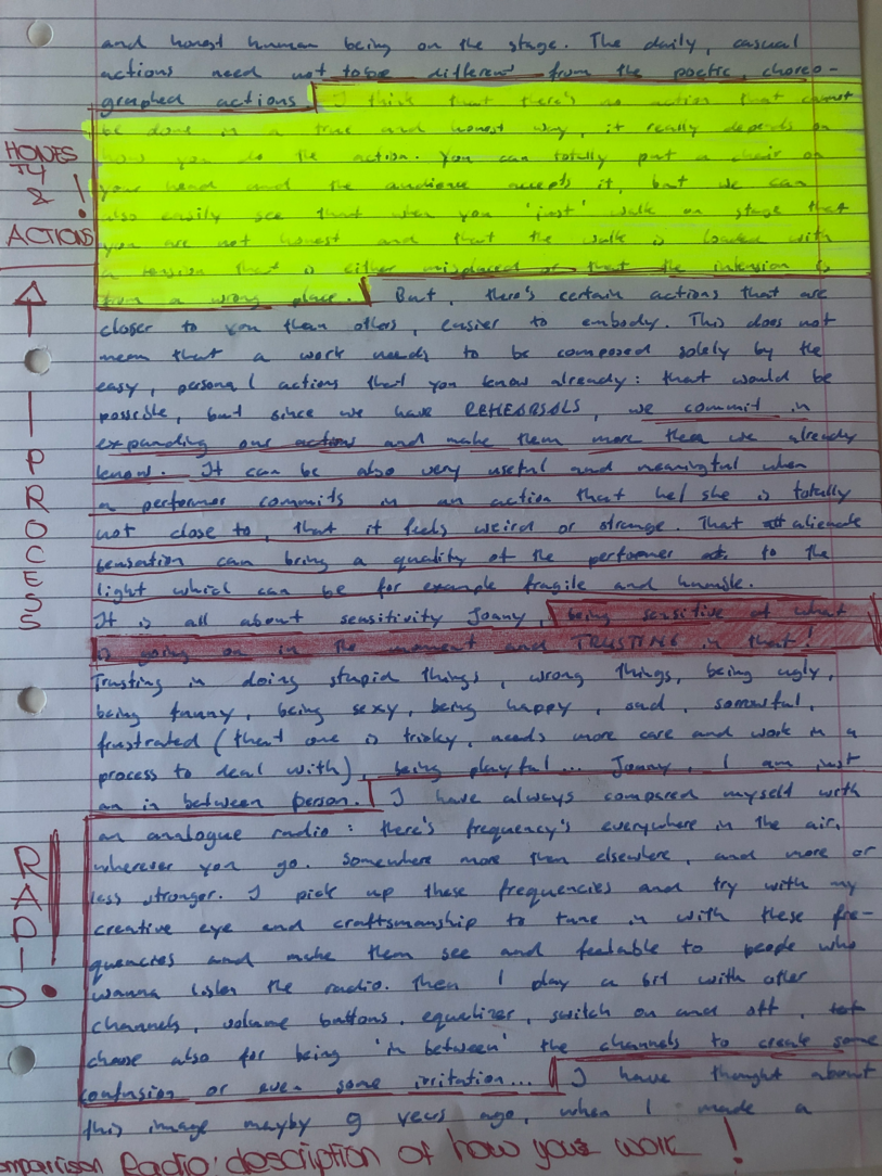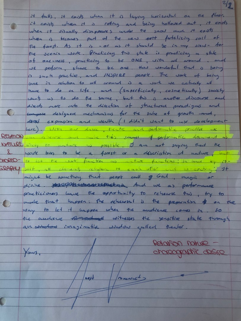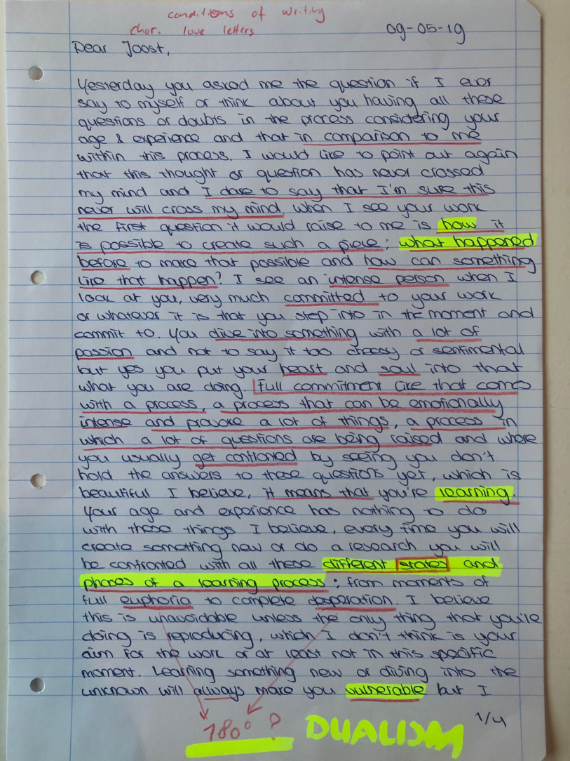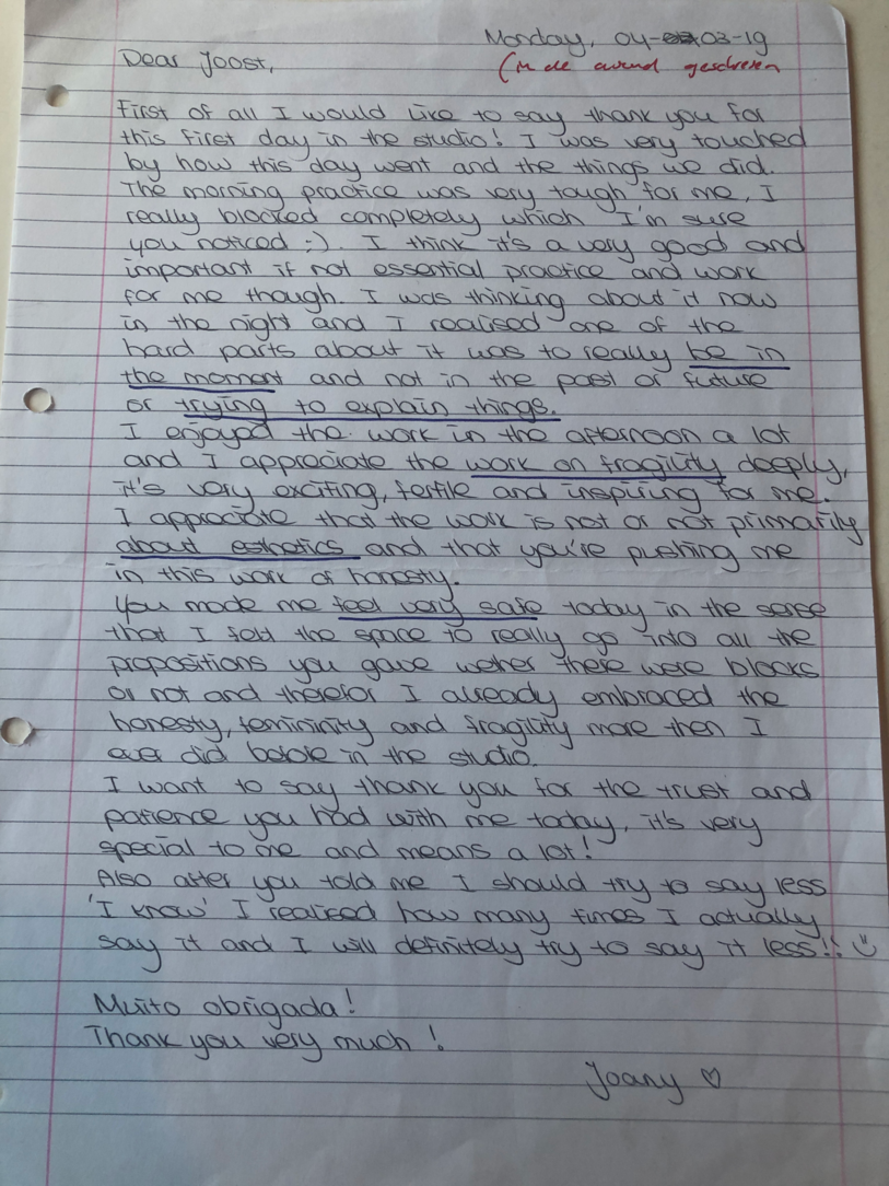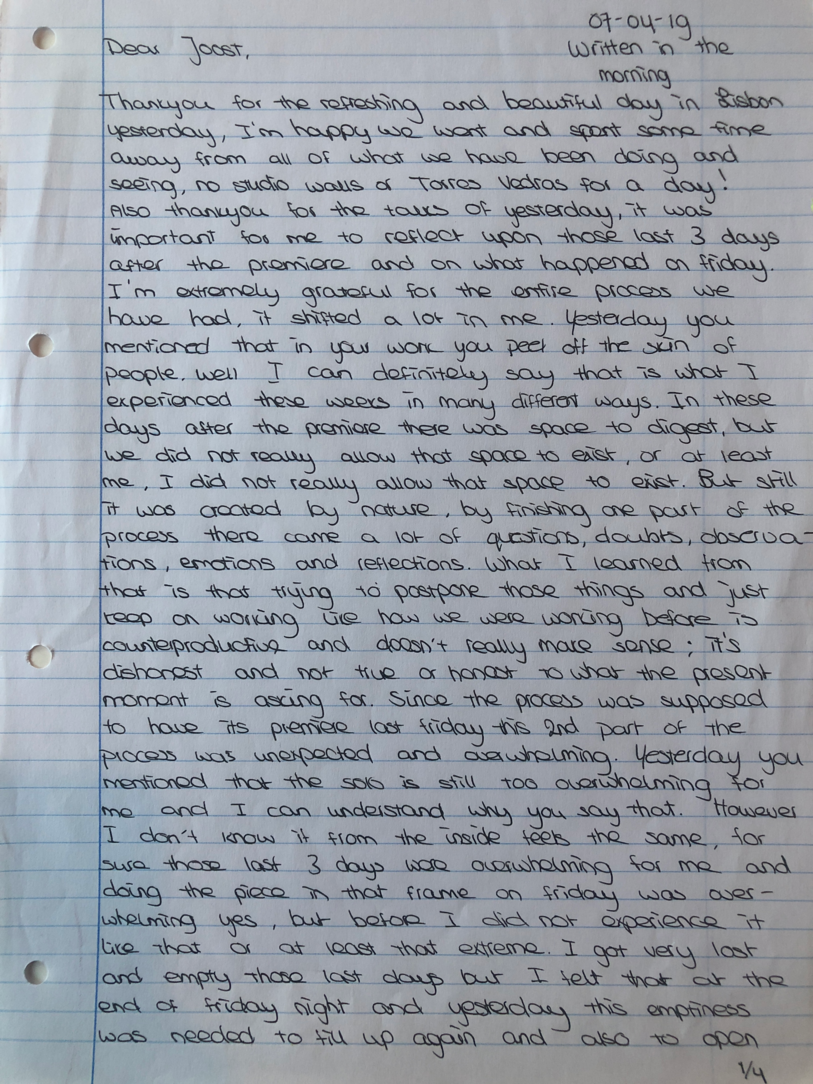 Choreographic Love letters is a method which I coined as an alternative, creative way of correspondence which supports the flow of thinking during the process, in between the rehearsals. The writing is done in a way to reflect upon what has been done during the rehearsals, sharing the thoughts of the studio moments and forwarding thoughts that feed into the coming rehearsals afterwards. Choreographic Love Letters is a form of continuous dialogue between the creatives involved in the process by hand-written letters.