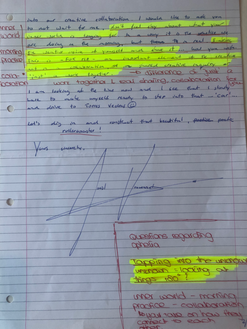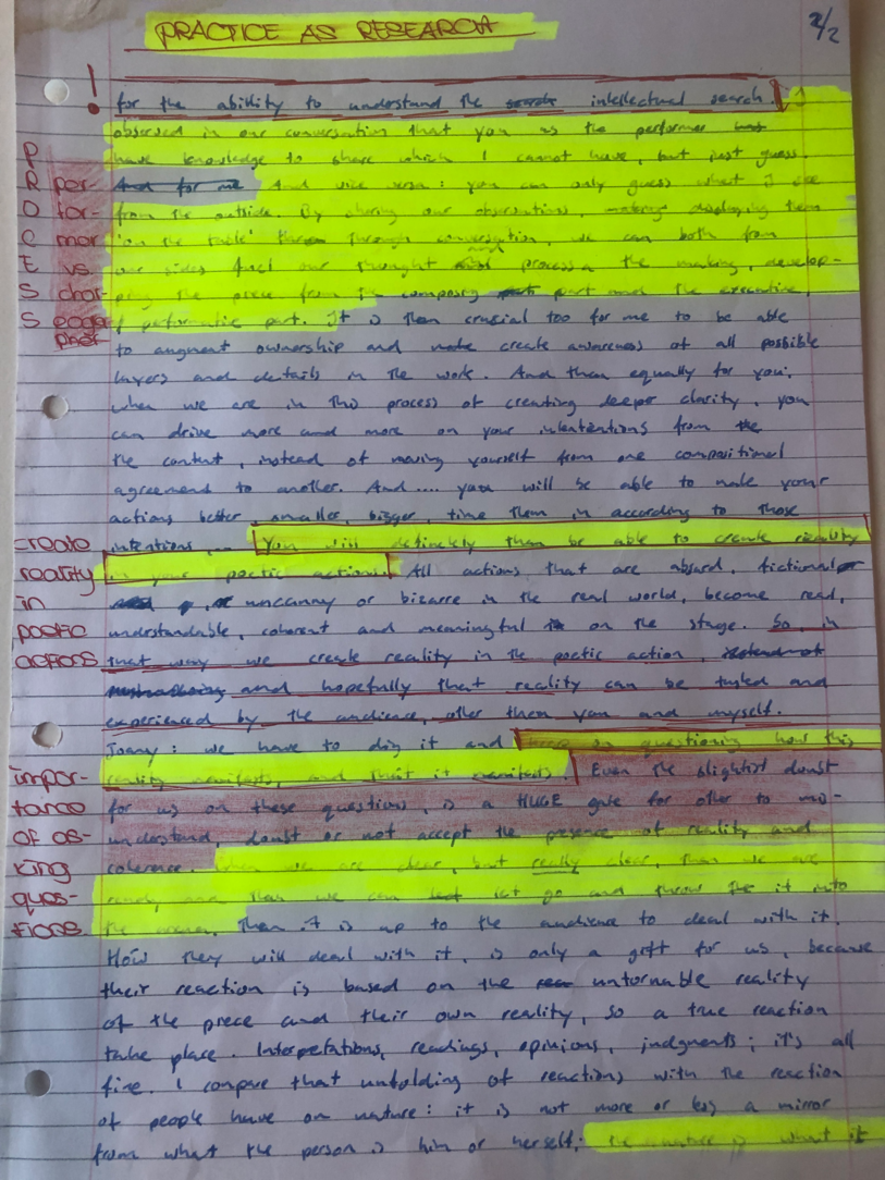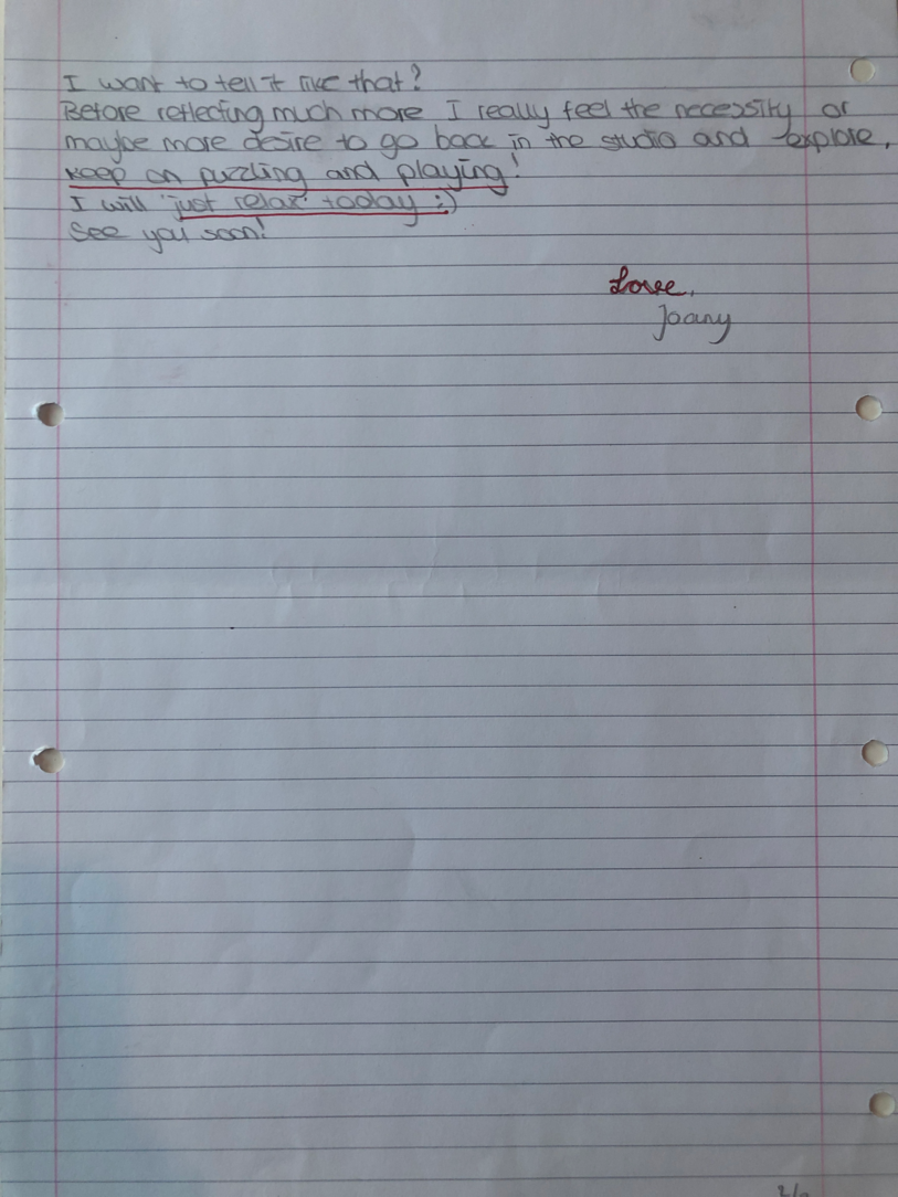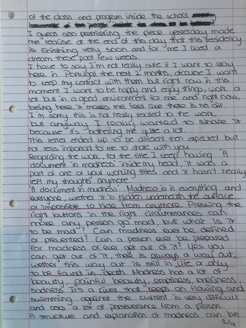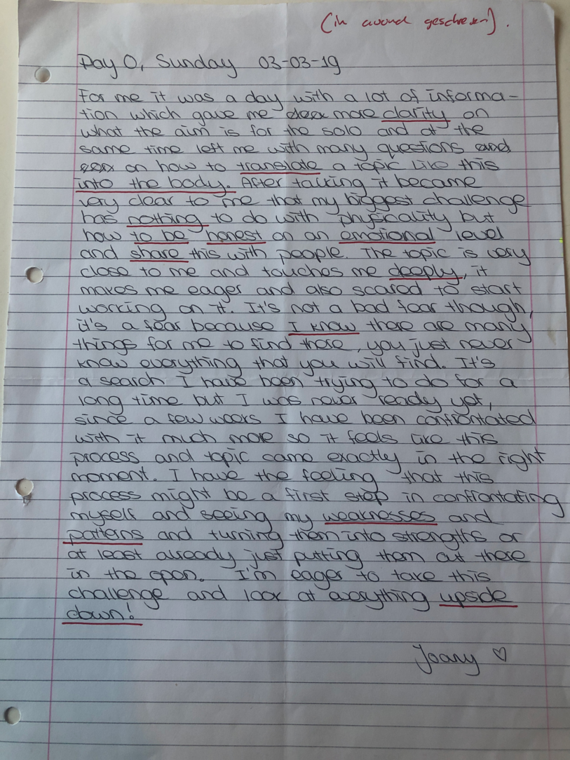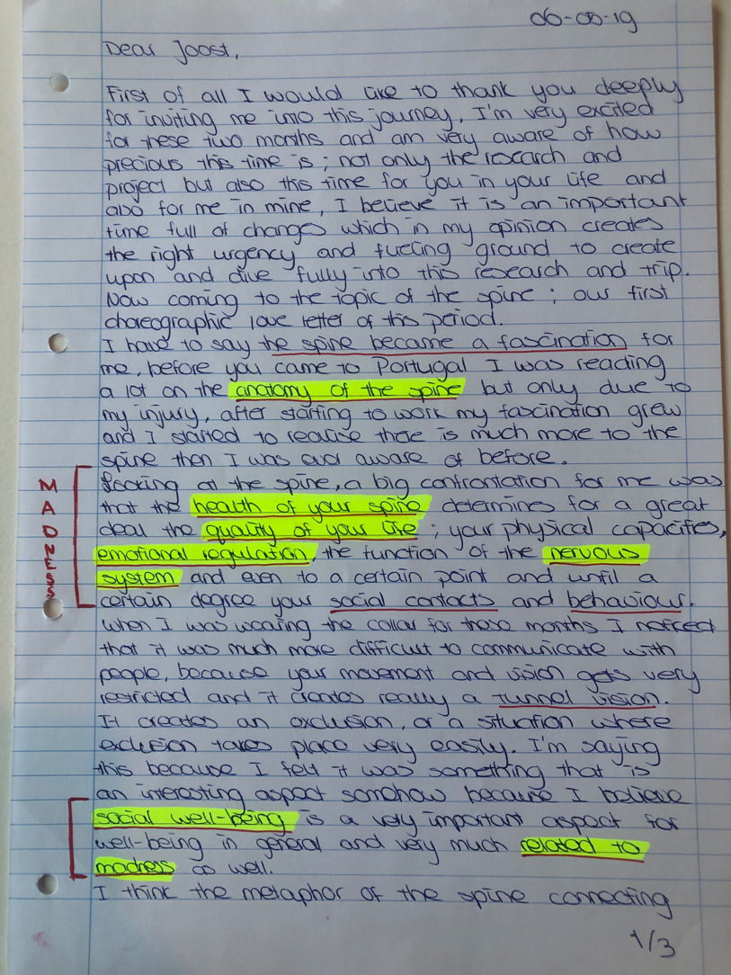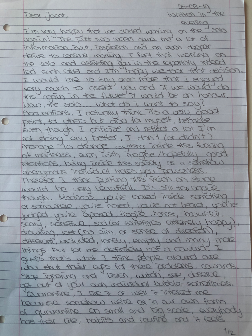 Choreographic Love letters is a method which I coined as an alternative, creative way of correspondence which supports the flow of thinking during the process, in between the rehearsals. The writing is done in a way to reflect upon what has been done during the rehearsals, sharing the thoughts of the studio moments and forwarding thoughts that feed into the coming rehearsals afterwards. Choreographic Love Letters is a form of continuous dialogue between the creatives involved in the process by hand-written letters.