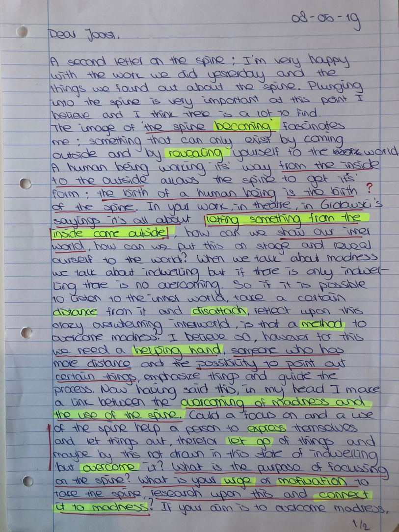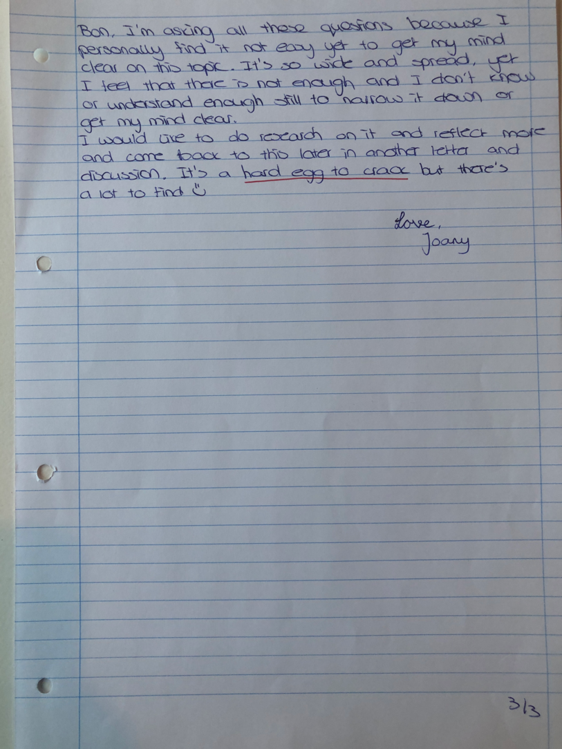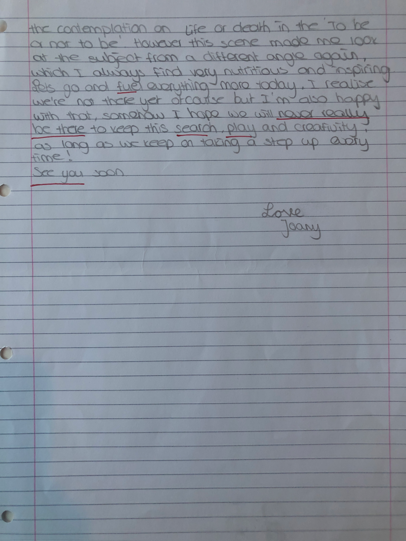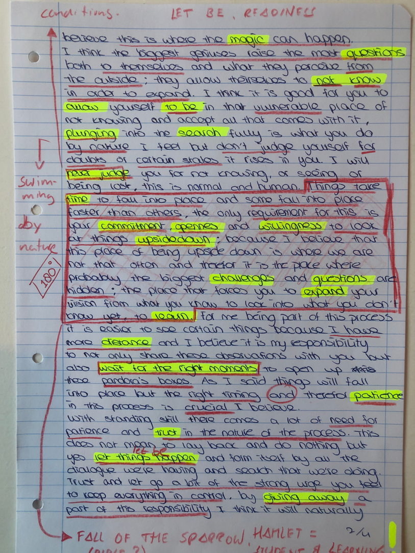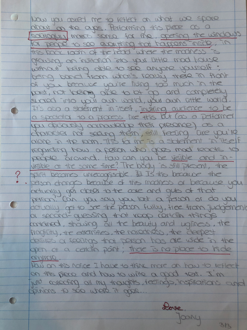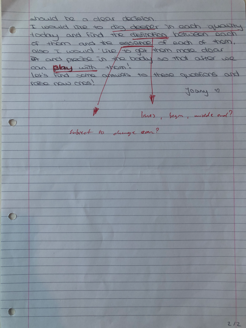 Choreographic Love letters is a method which I coined as an alternative, creative way of correspondence which supports the flow of thinking during the process, in between the rehearsals. The writing is done in a way to reflect upon what has been done during the rehearsals, sharing the thoughts of the studio moments and forwarding thoughts that feed into the coming rehearsals afterwards. Choreographic Love Letters is a form of continuous dialogue between the creatives involved in the process by hand-written letters.