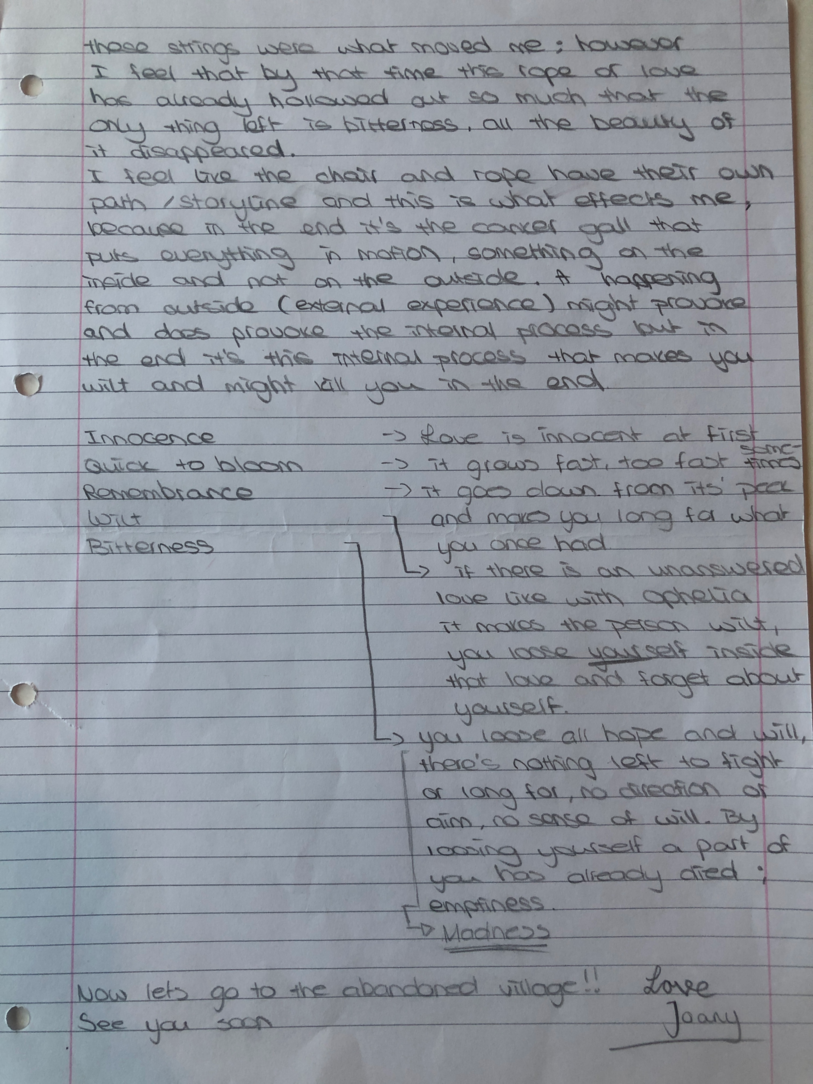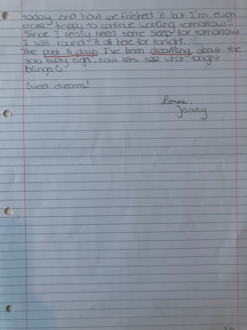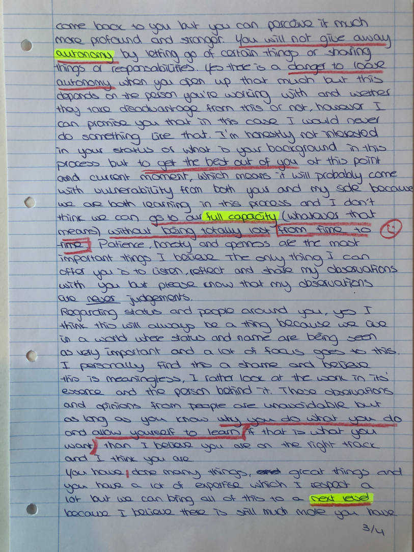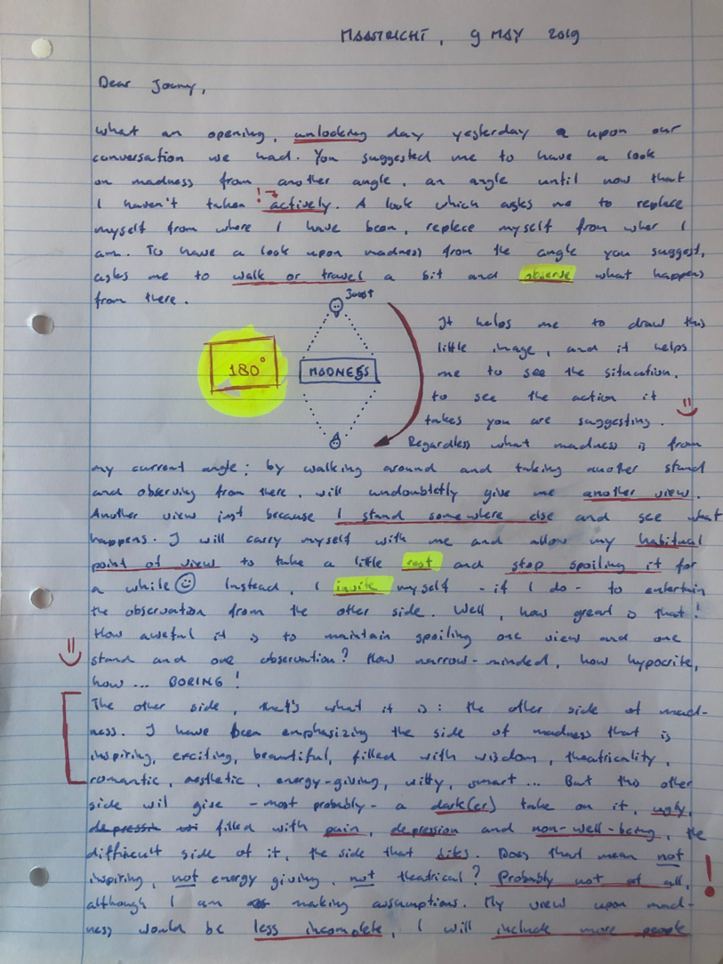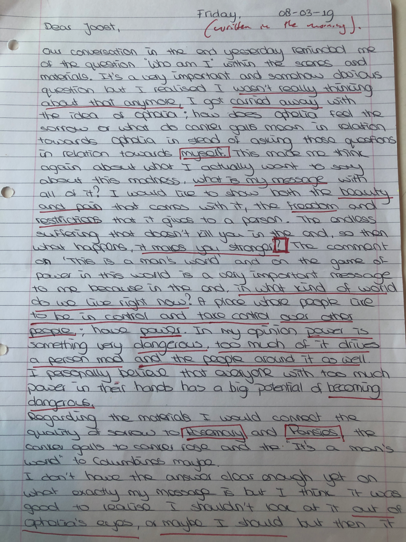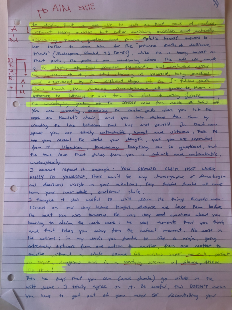 Choreographic Love letters is a method which I coined as an alternative, creative way of correspondence which supports the flow of thinking during the process, in between the rehearsals. The writing is done in a way to reflect upon what has been done during the rehearsals, sharing the thoughts of the studio moments and forwarding thoughts that feed into the coming rehearsals afterwards. Choreographic Love Letters is a form of continuous dialogue between the creatives involved in the process by hand-written letters.