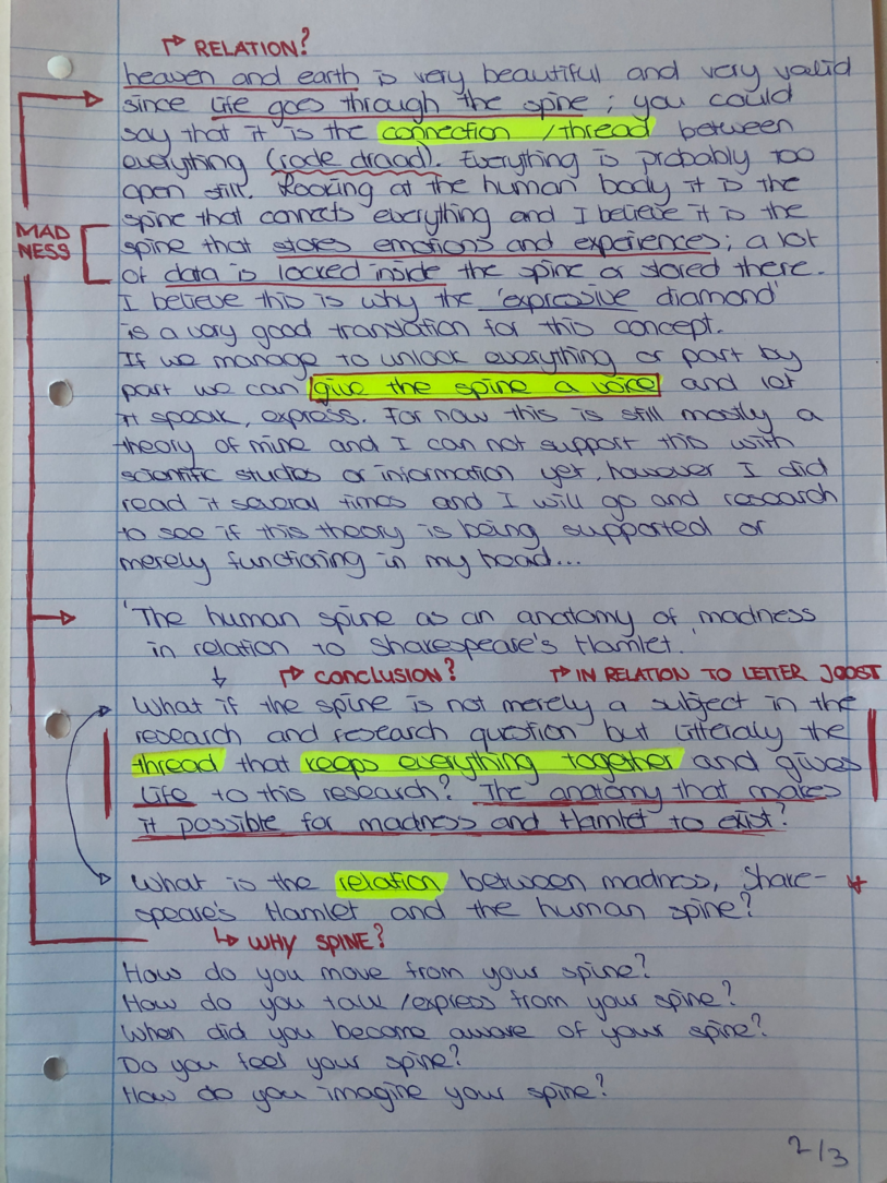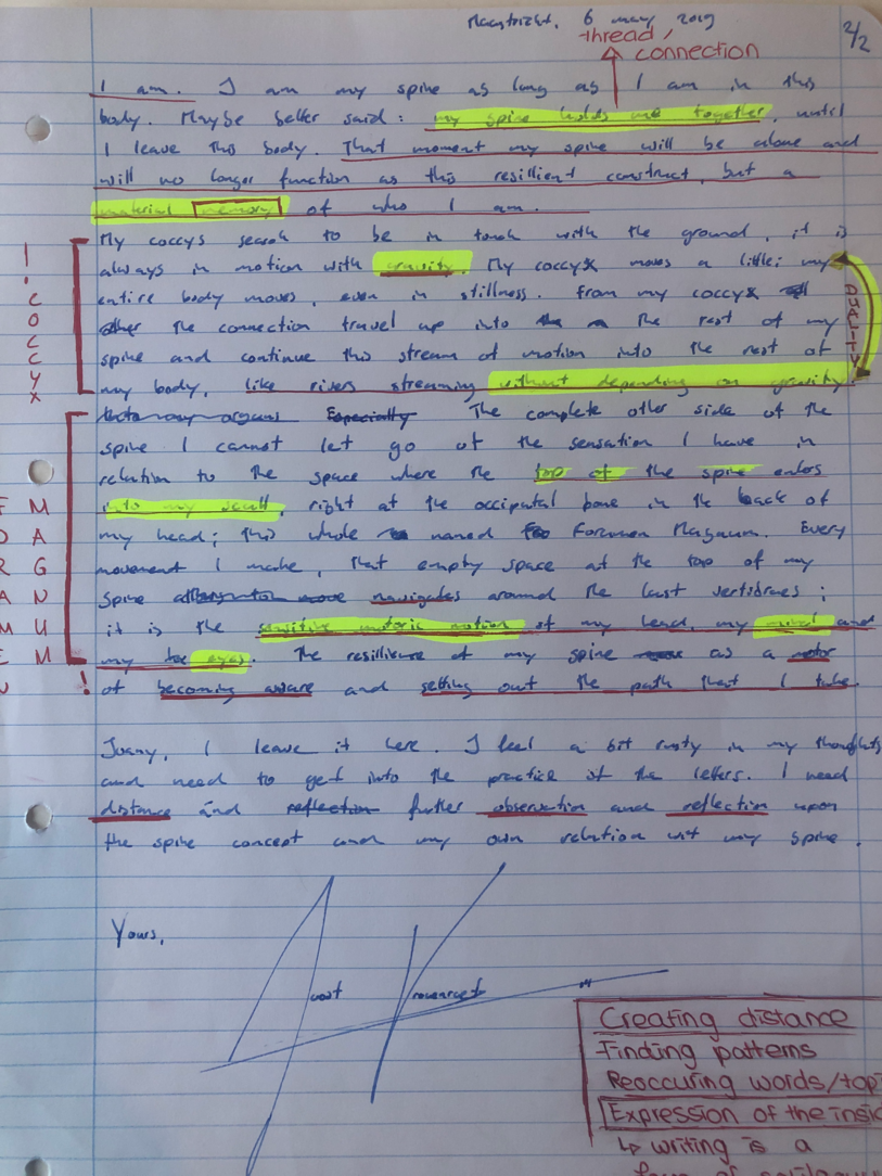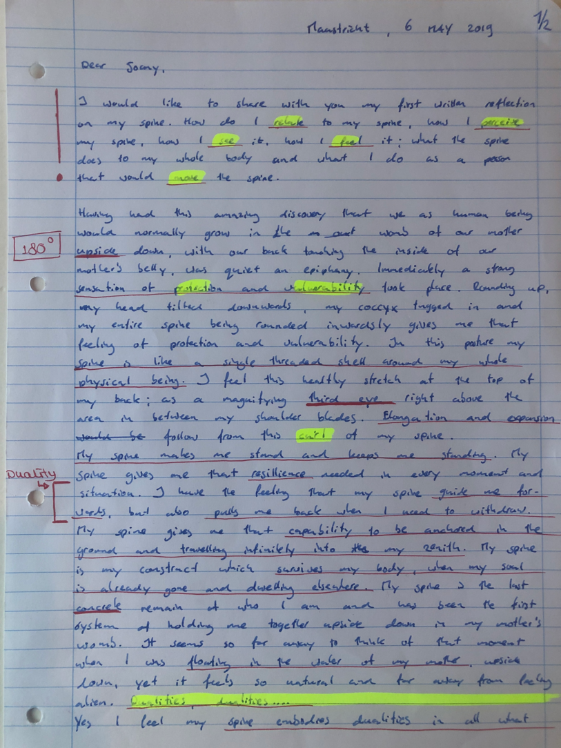 Choreohgraphic Love Letters is a parallel side-path to the daily routine of working and talking, in and out of the studio. Professor Robin Nelson, director of Research at the Central School of Speech and Drama of the University of London mentions in a lecture the need of ‘complementary writing’; a writing that takes place during the research inquiry as a practitioner researcher. Complementary writings support and influence the formation of the conceptual framework of the research. He uses the word complementary, because the writings compliment the performative practices. Similar to what he explains, the method of Choreographic Letters is a complementary practice of writing which supports and compliments the practices during the research.