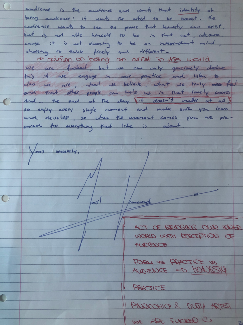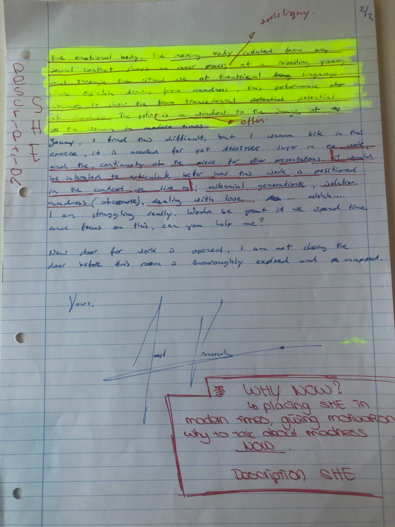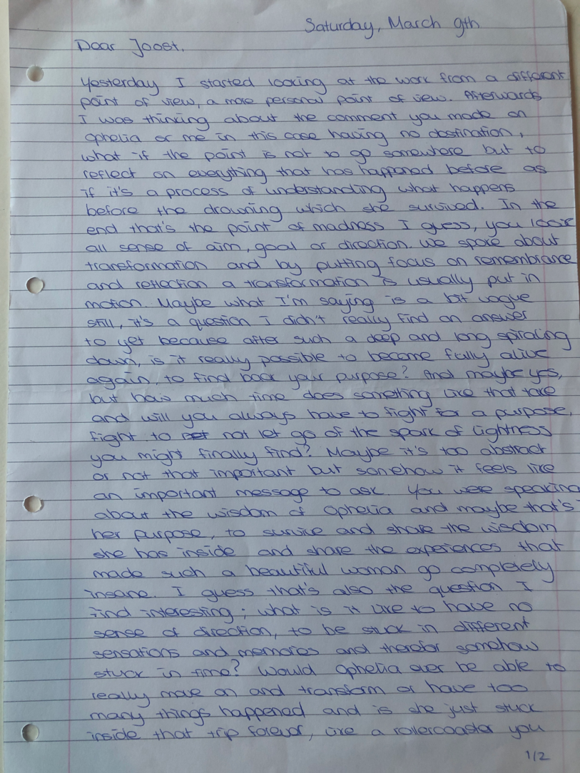 Choreographic Love Letters are written from a personal view; the way of writing is totally free, it can include academic writing, poetic and creative writing or even drawing. As long as the writing is coming from an intimate, personal scope. Each letter is a gift for the other, the sharing of the thoughts are from a place of care and love for the work. Questions and confusion, feelings, emotions, analytical reflections and epiphanies can be shared.