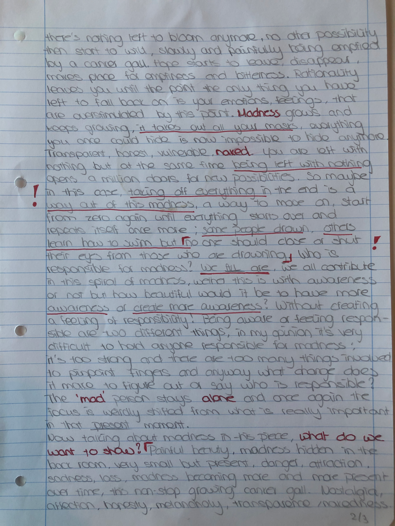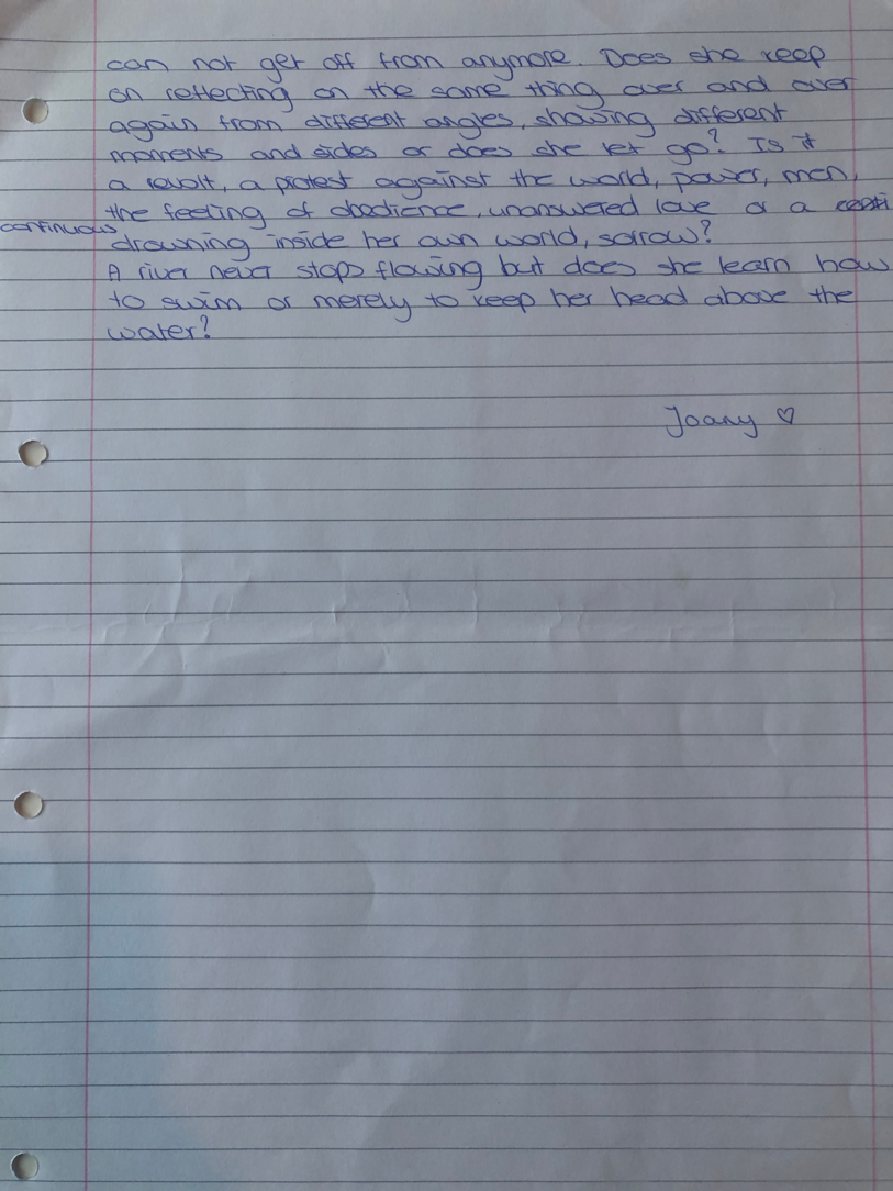 “Time transforms when I write; it transforms the quality thinking, I think I go deeper in my thoughts. When I write I ACTUALLY take the time to observe what is really inside of myself in terms of emotion, reflection and any kind of sensation that I feel like sharing…”