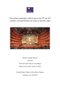 Name: Mariana Andrade Pimenta Main Subject: Early Music Singing Research Coach: Inês de Avena Braga Title of Research: The technical principles of Bel Canto in the 18th and 19th centuries: an experimental case study on dynamic range Research Question: How did the vocal exercises from Bel Canto singing influence my singing technique, especially in the dynamic range associated with pitch? Summary of Results: The format chosen by the author for this investigation was the Research Paper, as this study required an investment on knowledge about Bel Canto singing technique and the application of the latest into her singing practice, which resulted into a deep reflection and reached new conclusions. The focus of the practical sessions of the author was on her dynamic range. The purpose was to increase flexibility in her dynamic range in the different registers of the voice. The research went through the following process: (1) an audio recording of G. F. Händel aria: “Se Pietà di me non senti”, from the opera Giulio Cesare; (2) in this same phase of the research, she used the software Voice Profiler 5.1 to record her Voice Range Profile (VRP), the same piece and the vowel /a/, throughout the vocal registers, exploring the complete dynamic range of her voice; (3) after three months of practicing specific exercises designed to train the dynamic range, the same recordings were made and also a comparison with the first ones. The results indicated that the training had an impact: An increase of flexibility in realizing Messa di Voce was verified in the author’s middle vocal register. This impact did not happen in the highest vocal register, where technical differences were not detected by the VRP recording. The latest result is also applicable in the Händel aria. This method has proved to be beneficial in the middle section of the author’s vocal range. The appliance of this method is a work in process, which the author believes that it should bring more beneficial results; it offered the author a much bigger awareness of the breathing system, which resulted in a better quality Messa di Voce. The knowledge gained from the sources from the 18th and 19th centuries, guided the practical study in this investigation. In future studies, the author wishes to further research Italian vocal technique and use this important knowledge of historical information by transferring it to her singing practice. The outcome of the present study is an interesting interdisciplinary fusion between Old Italian vocal pedagogy of Bel canto singing and advanced vocal technology. Biography: Mariana Pimenta is a soprano born in Madeira Island, Portugal. She graduated in Classical singing in Aveiro, Portugal in 2011 and started her specialization in Early Music Singing at the Royal Conservatoire of The Hague in 2012. As a performer Mariana has been performing as a soloist and in ensemble singing, in some countries, as The Netherlands, Portugal, Italy and Ecuador.