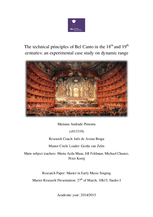 Name: Mariana Andrade Pimenta Main Subject: Early Music Singing Research Coach: Inês de Avena Braga Title of Research: The technical principles of Bel Canto in the 18th and 19th centuries: an experimental case study on dynamic range Research Question: How did the vocal exercises from Bel Canto singing influence my singing technique, especially in the dynamic range associated with pitch? Summary of Results: The format chosen by the author for this investigation was the Research Paper, as this study required an investment on knowledge about Bel Canto singing technique and the application of the latest into her singing practice, which resulted into a deep reflection and reached new conclusions. The focus of the practical sessions of the author was on her dynamic range. The purpose was to increase flexibility in her dynamic range in the different registers of the voice. The research went through the following process: (1) an audio recording of G. F. Händel aria: “Se Pietà di me non senti”, from the opera Giulio Cesare; (2) in this same phase of the research, she used the software Voice Profiler 5.1 to record her Voice Range Profile (VRP), the same piece and the vowel /a/, throughout the vocal registers, exploring the complete dynamic range of her voice; (3) after three months of practicing specific exercises designed to train the dynamic range, the same recordings were made and also a comparison with the first ones. The results indicated that the training had an impact: An increase of flexibility in realizing Messa di Voce was verified in the author’s middle vocal register. This impact did not happen in the highest vocal register, where technical differences were not detected by the VRP recording. The latest result is also applicable in the Händel aria. This method has proved to be beneficial in the middle section of the author’s vocal range. The appliance of this method is a work in process, which the author believes that it should bring more beneficial results; it offered the author a much bigger awareness of the breathing system, which resulted in a better quality Messa di Voce. The knowledge gained from the sources from the 18th and 19th centuries, guided the practical study in this investigation. In future studies, the author wishes to further research Italian vocal technique and use this important knowledge of historical information by transferring it to her singing practice. The outcome of the present study is an interesting interdisciplinary fusion between Old Italian vocal pedagogy of Bel canto singing and advanced vocal technology. Biography: Mariana Pimenta is a soprano born in Madeira Island, Portugal. She graduated in Classical singing in Aveiro, Portugal in 2011 and started her specialization in Early Music Singing at the Royal Conservatoire of The Hague in 2012. As a performer Mariana has been performing as a soloist and in ensemble singing, in some countries, as The Netherlands, Portugal, Italy and Ecuador.