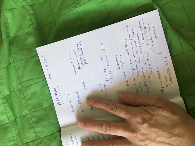 Meillä tuli pariharjoitteessa menneisyyden ja lapsuuden asioita, ja materiaalisuus, ja miltä materia tuntuu. Vaikka piti olla sellainen minkä haistaa, missä on tuoksu, niin oli pakko ottaa se missä oli se tuntu.
