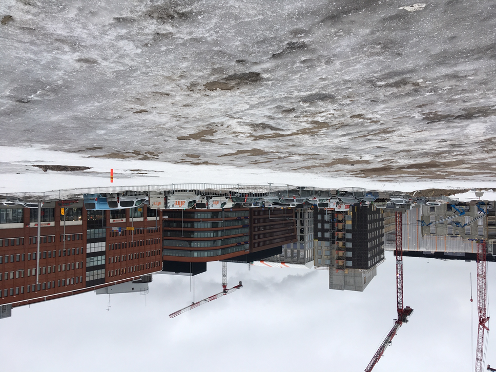 The gaze seeks as the focal point a construction worker who stands out as a yellow spot on the skyscraper's scaffolding. I follow the movements of the yellow spot, the constructive reality. The voices from the city concretise; they seem distant. My own body starts to calm down from the demands of the verbal language.