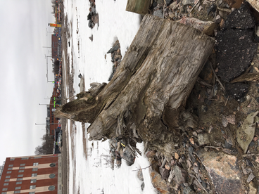 Etsin materiaaleja: sementtirenkaat ja eristenauhat. Hylätty muovinen kauppakassi jäätyneenä, jäädytettyjä pakasteita. Roskien keräilysauva kiinnittyneenä jäiseen maahan, lähellä kauppakassia. Pidän sauvasta kiinni ja yritän taistella jäätä vastaan. Mieli on rauhaton. Äänimaisema on muttei se häiritse.