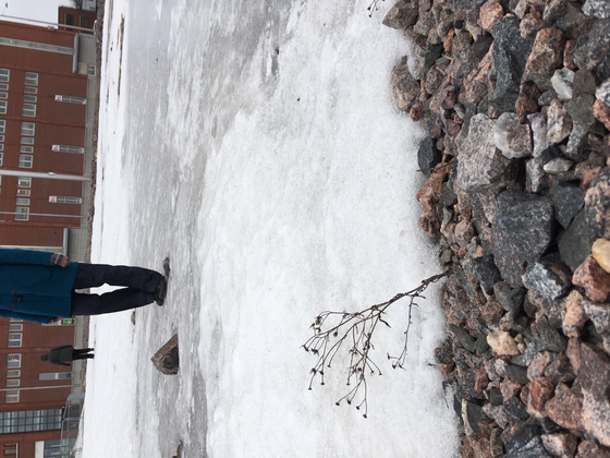 Etsin kasvin, jonka kanssa haluan luoda yhteyden. Se on talven törröttäjä, joka puskee esiin hiekkakasasta. Oikeastaan se on kuollut mutta muistuttaa elämän katoavuudesta olemassaolollaan. Ryömin kasvin viereen, kosketan sitä. Se ärsyttävän pisteliäs kasvi mutta tuntuu hyvältä tuntea sen kosketus omalla poskellaan.
