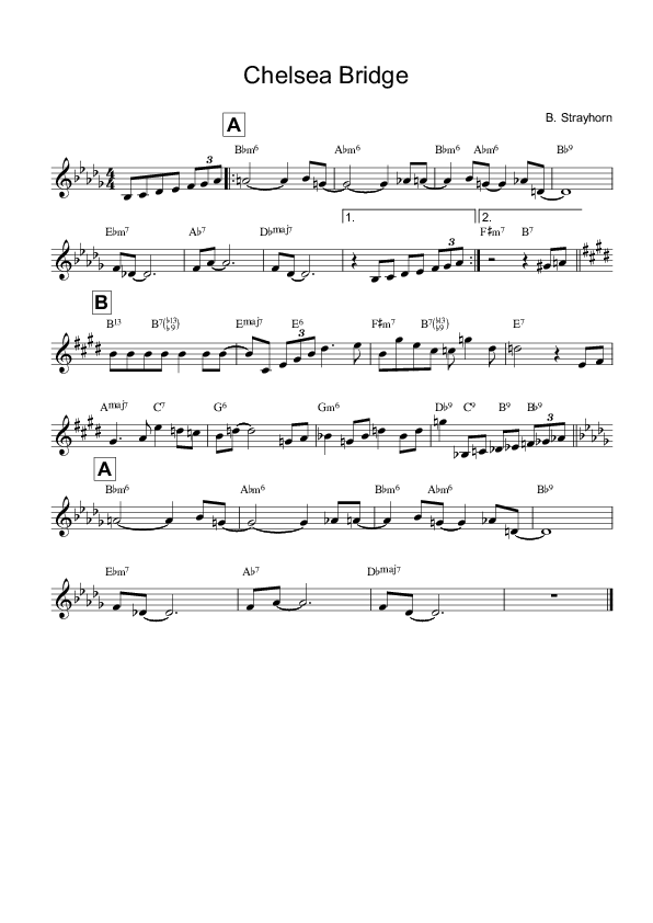 The basic idea of Chelsea Bridge is a modal approach (the form is a classic AABA): It starts with a Bbm6 chord, with the major seventh on top in the melody, then shifting a whole-step down to Abm6 with a major seventh on top in bar 2, repeating this movement within bar 3. The major seventh does not resolve into the tonic. This “parallel movement of tonally independent chords” (ibid.) is a reference to Debussy, and also to be found in Maurice Ravel’s Valses Nobles et Sentimentales. The theme continues by establishing the key of Db in a VI7-IIm7-V7-I progression. The 8-bar “A” section can be divided in two parts: first, the atmospheric Minor6,maj7 harmonies with a melody moving off-beat within the small range of a minor third, so it seems to be floating on top of this mystic soundscape; then, the very old-fashioned cadence with just the third and fifth of Db as melody notes. The bridge modulates to E, passes the keys of A and G and ends on an unstable Db7 chord, while the melody is very ‘cantando’ and expressive. The last bar of the bridge leads back to the head through descending dominants: Db9-C9-B9-Bb9, unusual, but a stylistic device very typical for Strayhorn.