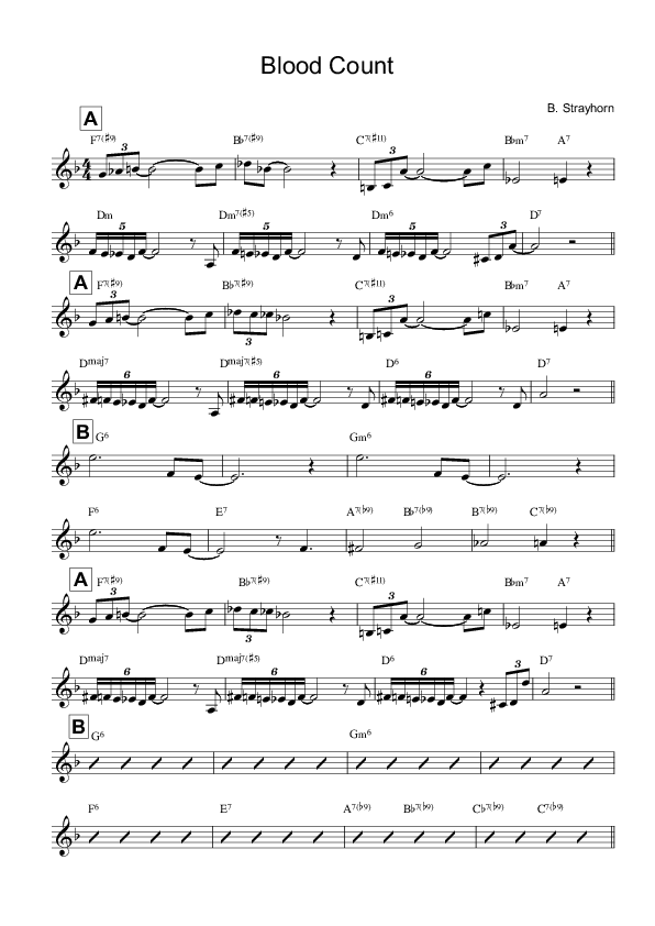Blood Count is written in D minor. The form could be described as AABAC, with slight differences between the “A” sections. “A” consists of two essential parts: first, 4 bars of altered dominants underlining a 2-bar phrase that is imprecisely sequenced. Starting out with two 16th-notes tied to a following long note, the phrase is unsteady, rhythmically almost free.