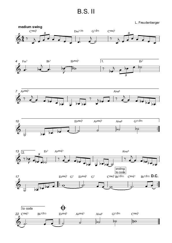I have made use of the harmonic dualism based on the diminished seventh chord, as described in the chapter “Lush Life”. Here, the tonal center alternates between Cmaj and Ebmaj, connected through the mutual diminished chord B-D-F-Ab. It is the minor subdominant that leads to the next key: the progression Fm7-Bb7 in bar 4 seems like a minor fourth degree of C, but also serves as a IIm7-V7 to Ebmaj. Then, before the repeat sign, Abm is the minor subdominant of Eb, but also, it works as a tritone-substitue for Dm7b5. The following dominant G7 modulates back to C.