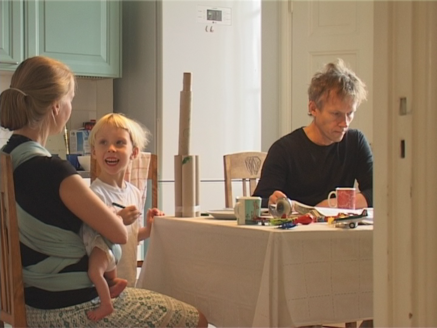A view through a kitchen doorway. On the right-hand edge of the picture the doorframe, behind it a table covered with a white waxcloth, and three chairs. At the table are three people: a woman, a five-year-old boy and a newborn baby. The baby is in a sling at the mother’s breast. On the table are a newspaper, mugs, plates, a tub of margarine, a roll of sticky tape, airplanes and a space rocket made from kitchen roll. In the background a fridge-freezer, a dishwasher and kitchen cupboards. On the sink unit a small white bowl and a mirror. The mirror is leaning against the tiled wall.