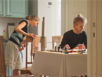 After the summer school, the muteness of the man who appears in Morning got yet one more, realistic-feeling explanation. This was suggested by my supervisor Elina Heikka, who has been observing my way of working (and my life) for several years now. To Heikka, the video does not so much say what the man is like as a father or as a human being, but rather how he relates to what his artist-spouse does. The man does not take part in his spouse’s art projects, but agrees to be there in the background. He does not start “acting” or portraying anything, but lets the woman do her work. This is, in fact, also the role that I offered to the man. I don’t remember precisely what words I used, but the idea was this: “Is it OK if I film a bit in the kitchen, you don’t have to do anything…”
