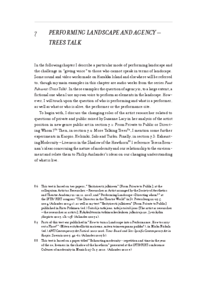 These works are discussed in English in chapter 7 "Performing Landscape and Agency - Trees Talk" (pp 181 -214, pdf below) in Performing Landscape - Notes on Site-specific Work and Artistic Research. Texts 2001-2011. Acta Scenica 28. Theatre Academy Helsinki 2012. Available here.