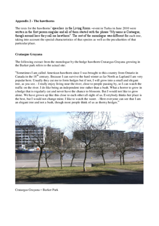 Trees Talk is a series of voice installations about talking trees, and talk about trees. Early summer is the time of the hawthorn. Here the hawthorn, Crataegus grayana, will have a chance to speak, in three languages alternating.