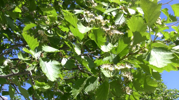 Like other hawthorns I have thorns, though they are rather small. They say it is difficult to distinguish between me and my relative Crataegus rhipidophylla who lives wild here too. Her leaves are saw-edged whereas my leaves are deeply lobed and only slightly saw-edged. My flowers are white and here I normally bloom in June. My fruits or haws are small egg shaped red berries with a single seed.
