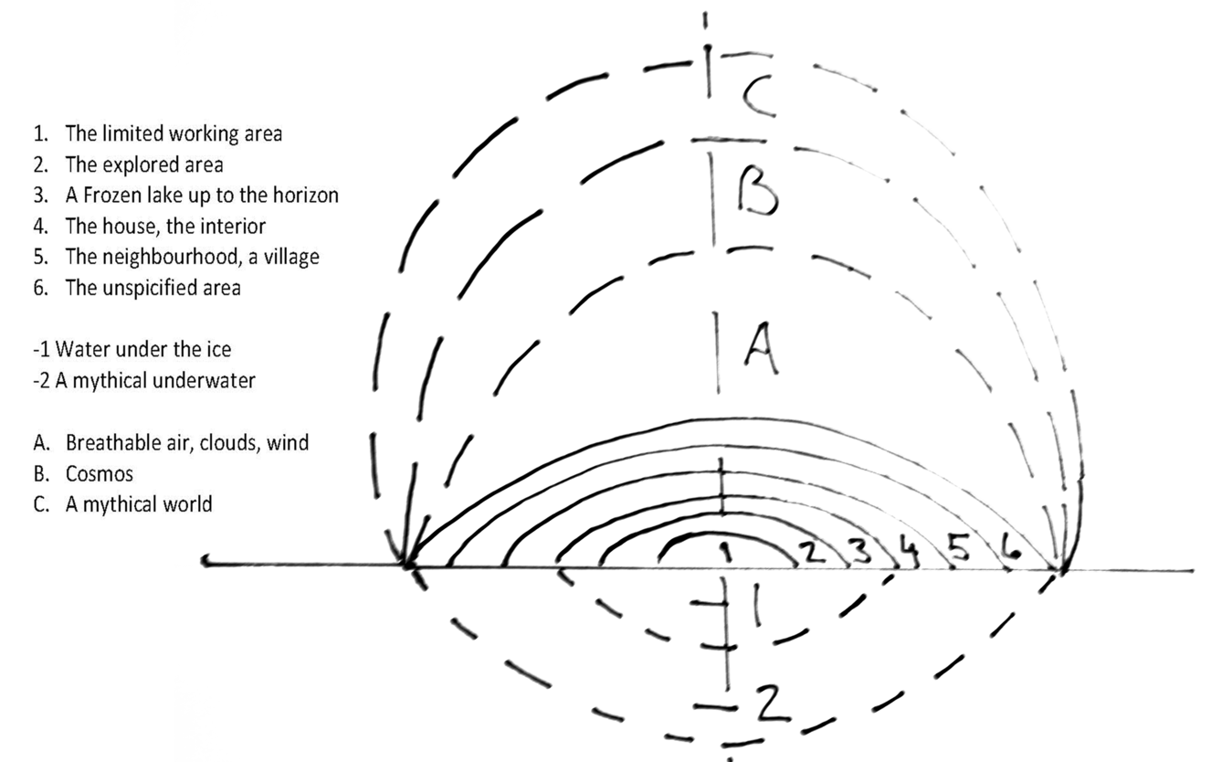 Geographer John Agnew has shown how human belief systems guide the way the world is perceived. In the Western world, in the latest, Copernican worldview, it has been customary since the end of the 15th century to divide the world into two parts—the explored and the unexplored. The explored areas are determined by order and development, while the unexplored areas represent chaos and danger (Agnew 2003, 15–33). In the image Expanding circles of the place, one can see how the unexplored area connected with danger and the unknown is confronted quicker on the vertical than it is on the horizontal axis. The danger lies near the frozen surface. The more one moves on the ice, the more detailed the place becomes, and the spheres of the unknown float further. Cosiness and danger are intertwined, and the borders of their realms are in a continuous movement. Like cosiness and danger, the mythical and real have a continuous interplay, where the crack on ice created by nature transforms to a mythical axis mundi. As we can see, the expanding circles of the place are not in dichotomous relationships to each other, but they are intertwined and in a continuous process of change in many ways.