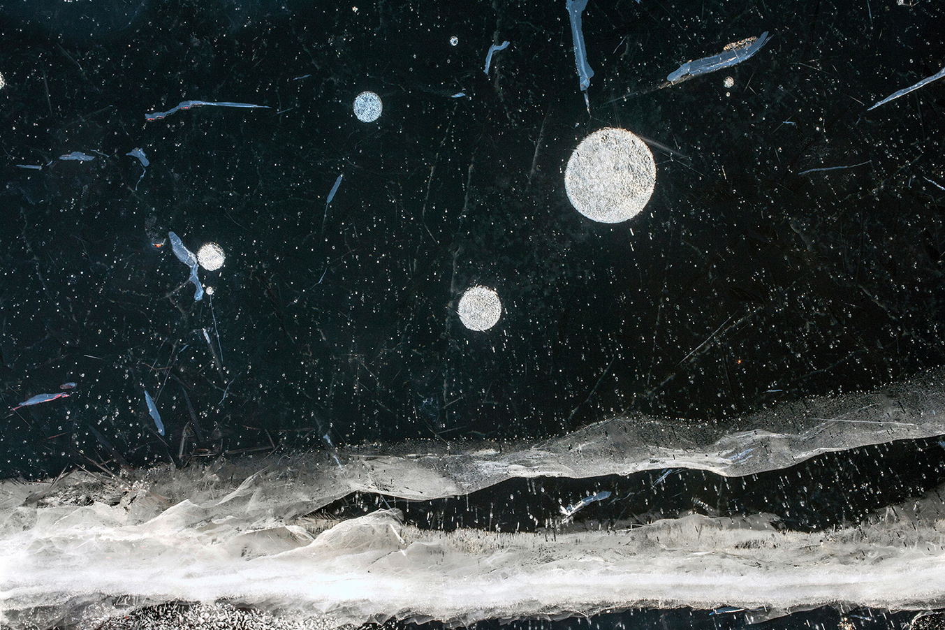 From the photography perspective, the main time for shooting is the early winter, when the black, unfrozen water can be seen through the thin ice cover. The white icy cracks against this black water forms a dramatic canvas for my imagination. Especially in the darkness of the evening, a white crack or white point against the black water is easily associated with cosmic views. Along this association, the understanding of one’s position widens from the local situation to the cosmic sphere. Thus, the place generates expanding interpretative circles about the immediate, nearby and cosmic places and spaces. Furthermore, the understanding of the periphery floats along this process. In my case, it is possible to find several expanding circles of the place. Horizontally, the core physical place consists of my restricted area of shooting and working. Then, there is the entire ice covered lake continuing to the horizon. Somewhere, there is an interior, a house that offers safety and a place for processing the icy experiences. Behind this comes the forest, the neighbourhood, the village. Looking vertically upward, the shooting place enlarges from the surface to the air I breathe and the wind, clouds, and finally, cosmic spheres. Correspondingly, underneath my feet, I apprehend the surface, the deepening water and the bottom. Somewhere beyond all these directional dimensions, there are the mythical places created by our culture and my mind.