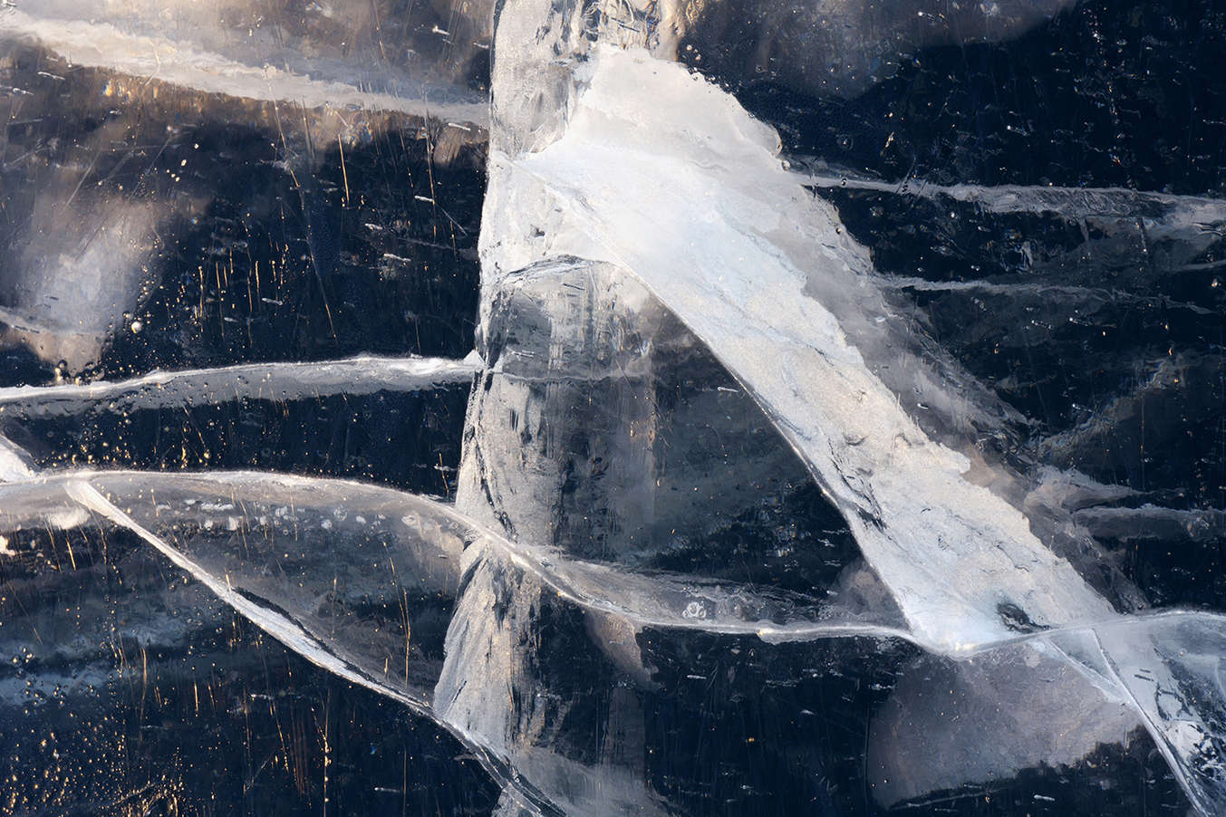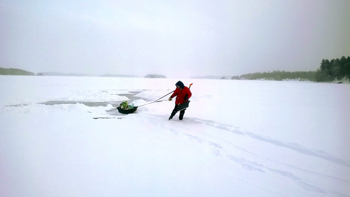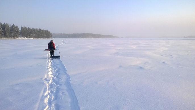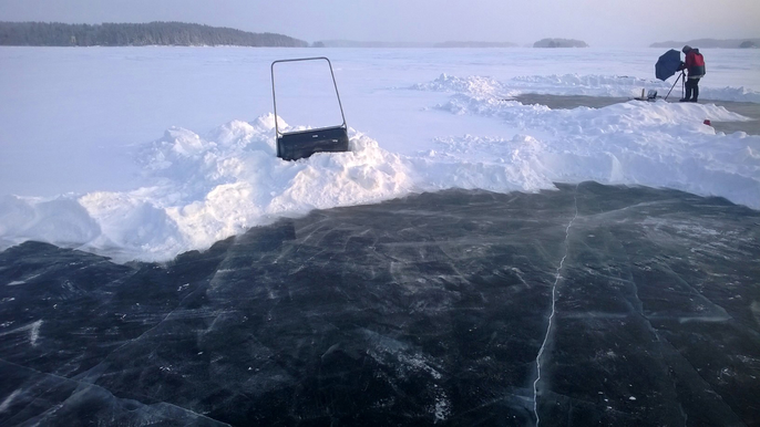 Photographing the ice is extremely physical. Cracks of interest for photography are not necessarily visible as such but must be searched under the snow. This means that, when I go to the ice, I have a lot of different supplies, and often, another person with me. In the early winter, one can go on the ice on foot, but in mid-winter, due to the thickness of the snow cover, only skiing is possible. In addition, we have two sleds, one with different brushes, shovels and scrapers for brushing snow and keeping it clean. The other includes accessories for shooting, including cameras, lenses, tripods and luminaires.