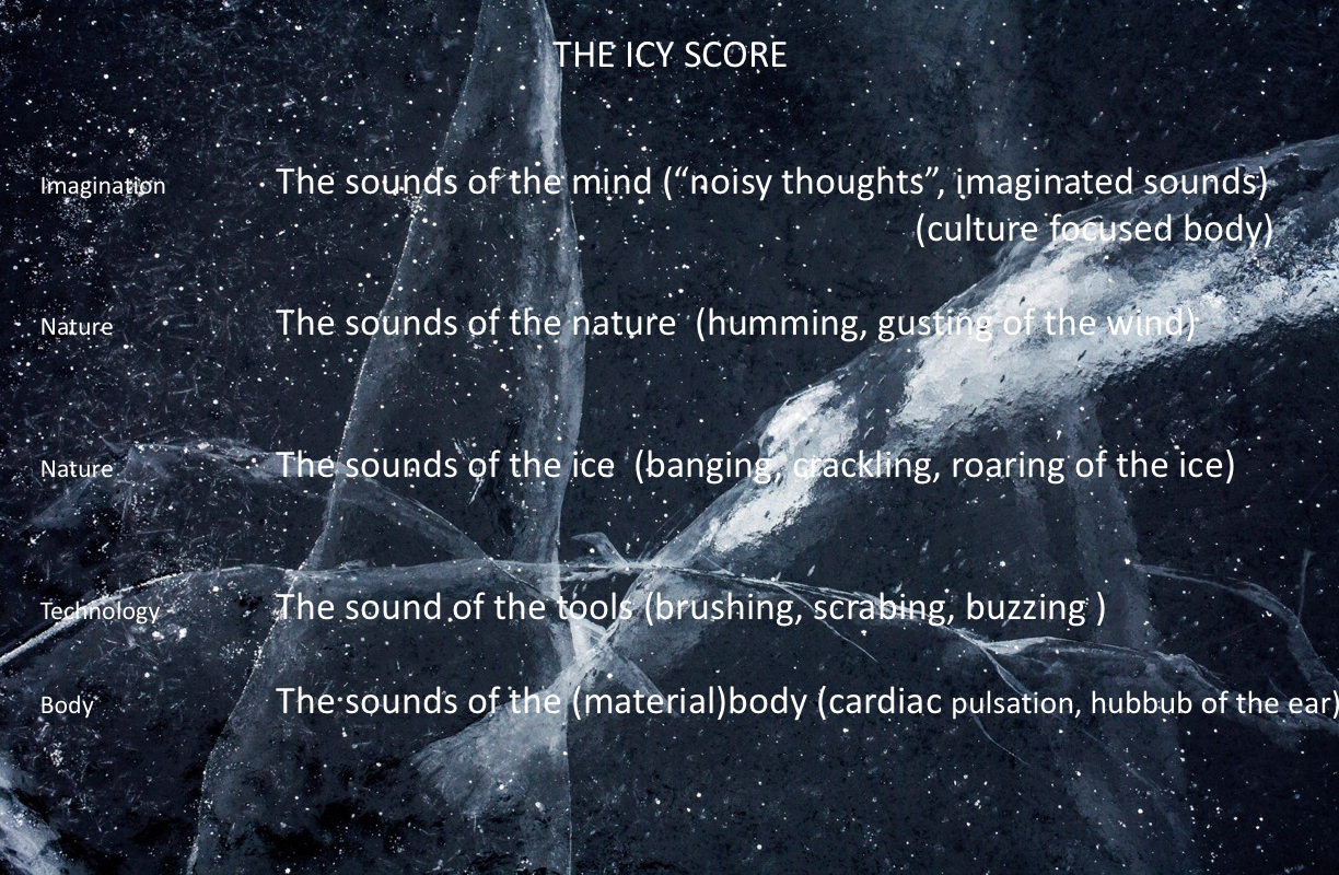 The Icy Score shows how the imaginary and the ‘true’, the perceived and non-perceived, interweave into Icy Score, into icy symphony. All of these sounds on the layers still have their own rhythm. Some of them are based on cyclical annual cycles, while some are linear, one-off or random. The Icy Score shows also how the innesphere and kinesphere are in constant dialogue by my body.
