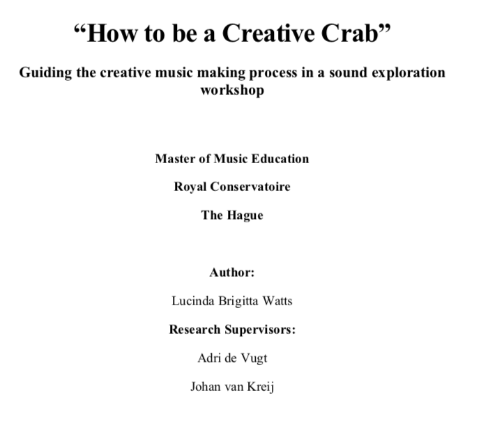 Creativity is a vital skill needed for a prosperous life in the 21st century. Where else to cultivate it but through music? Through the exploration of sounds, within a workshop, where the outcome is the creation of a musical piece that is not only of value but also original to the creator themselves, the researcher attempted to determine just that - How the creative music making process of students aged 9 to 14 can be guided with the utilization of electronic sound generators. Why electronic sound generators as instruments for creative music making? Because of the way they function, lending themselves out to exploration and inviting their user into a world of unfamiliar and intriguing sound possibilities. As a result of their hands-on, portable, easy to manipulate, unbiased and invitational properties electronic sound generators are ideal for anyone to participate in developing sound awareness leading toward the formulation of a creative product. The Crab Music workshop was designed and actualized by the researcher as a platform from within which the outcome of the research investigation could be determined. The researcher used three workshops as a case study to investigate, through the principles of action research, an outcome for the research question. Each workshop was analysed with the aim of determining if the guidance strategies employed were successful and where improvements could be made. Once determined, these improvements were implemented into the subsequent workshops as adjustments. As a result of the research it was found that all aspects of the workshop’s content and context needed to be focused on sound. Therefore, the incorporation of sound exploration and application activities designed to focus on sonic associations and musical development, instrument setup and focus on instruments sound production, sound analysis activities, specific sound related reflective questions, reflective listening activities and suggestions for sonic alterations and transformations, setting up problem-solving contexts with multiple possibilities for solutions and with ample time for development, was essential for the creative music making process to be successful. It was established that within a sound exploration workshop there will always be multiple factors that influence the creative music making process in various ways. But, it is the workshop teacher’s responsibility to have sufficient knowledge and skills to be aware of all these contributing factors in order to plan and carry out the goal of successfully guiding the creative music making process as it occurs.