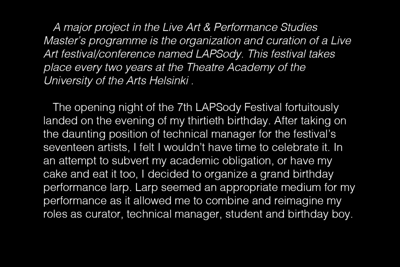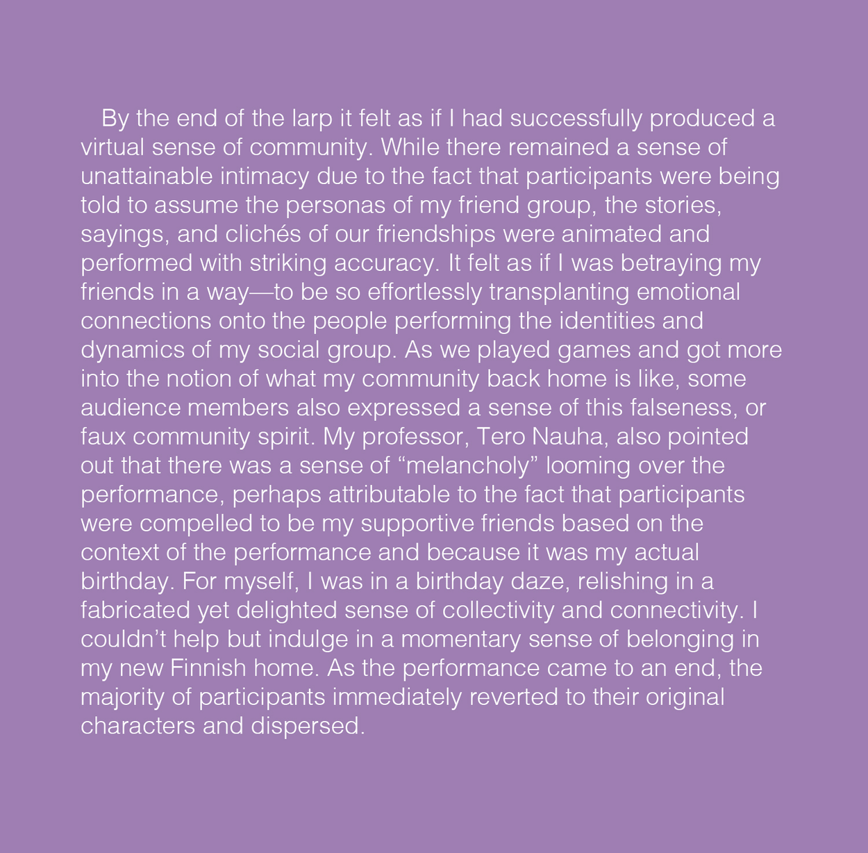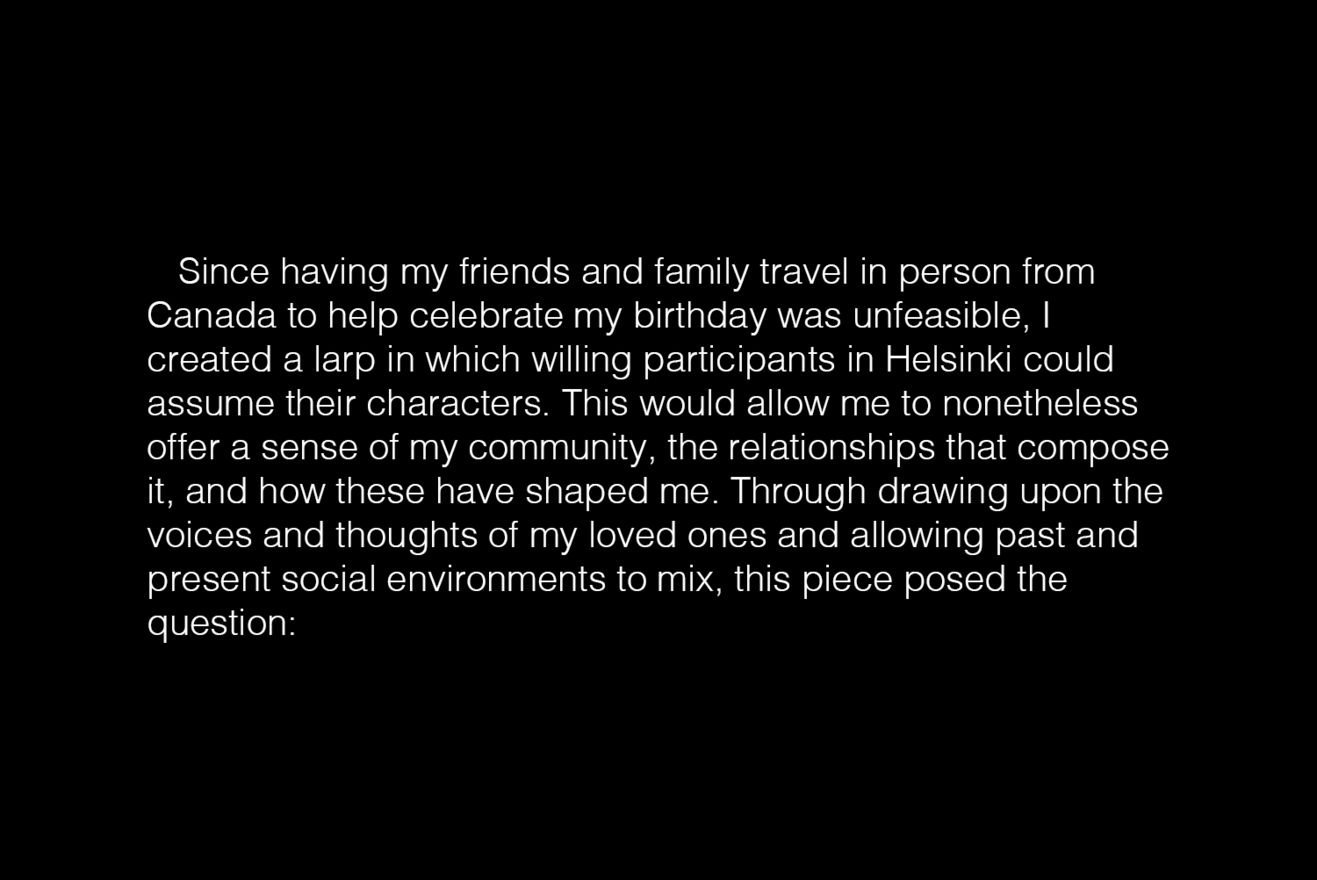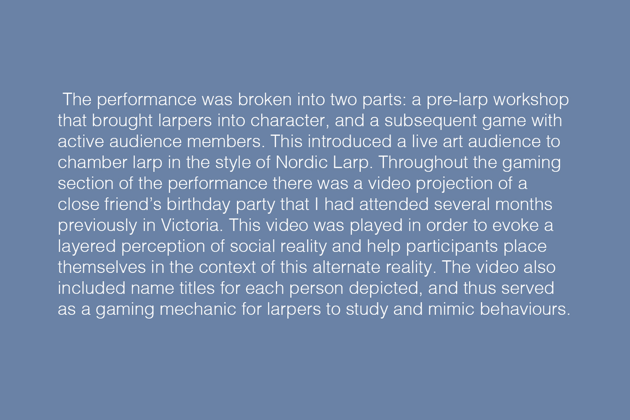 Throughout the performance participants built a deeper sense of understanding of the artist and his social milieu. In this way, the larp successfully explored the ways in which the self is socially produced and sustained through interaction, memory and community.