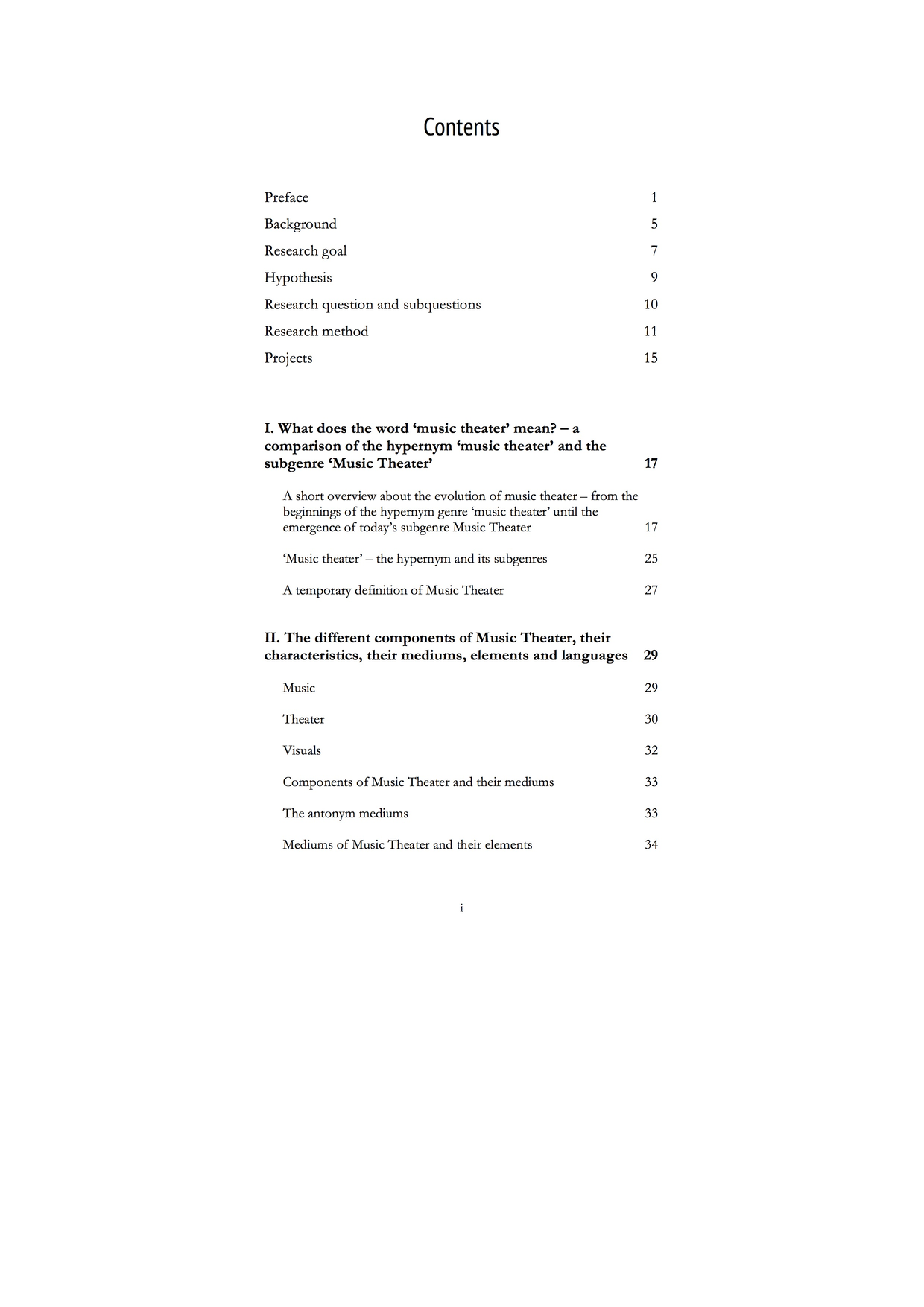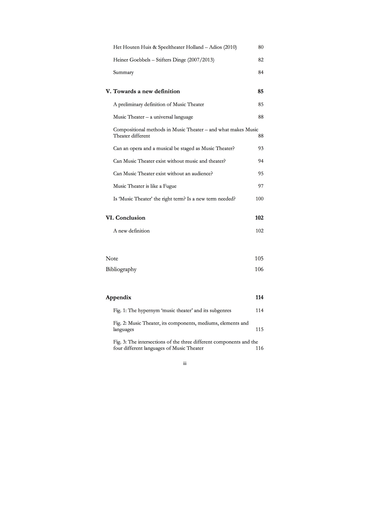 My research is not an attempt to explain what Music Theater should be or should not be. It is an attempt to formulate my own concept – a sort of manifest – based on my own ideas and the history of this subgenre, which, nevertheless, will hopefully have more than just a personal value. I sincerely hope that by researching the history of music theater, analyzing the components and the interaction of the latter in Music Theater, I can also provide new insights for other Music Theater makers. I even hope that through putting my ideas into words and making a clear statement about my concept of Music Theater, a discussion can be initiated, which will lead to debates in the field of music theater and Music Theater. This might allow the phenomenon Music Theater to be further developed as a subgenre, following that, maybe one day, Music Theater will be defined as a clear stream of art with a history book and characteristics that are universally agreed upon.