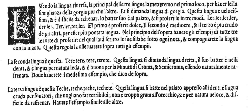 The third tonguing is this: Teche, teche, teche, teche. This tonguing is articulated in the palate close to the teeth, and is a crude [hard] tonguing for players who want give an effect of terror.[6]”