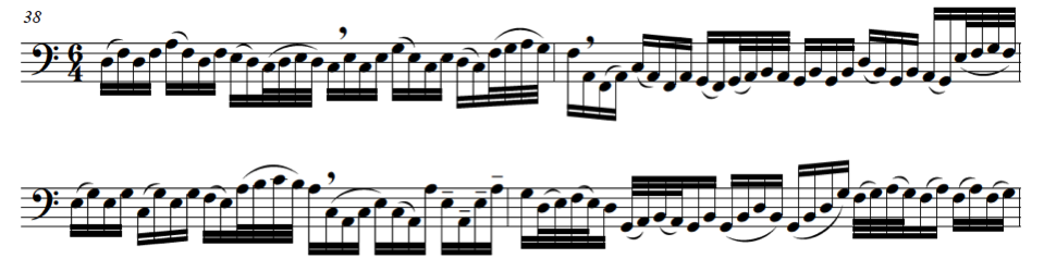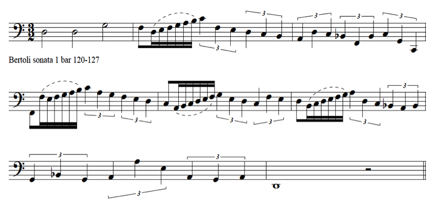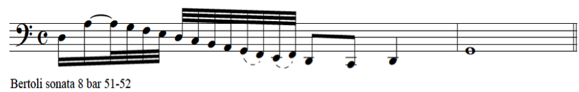 If we compare the compositions of these two virtuosic dulcian players with bass diminutions for the voice as we have discussed in the previous chapter, we can observe similarities and differences. The treatment of division patterns by De Selma and Bertoli in their sonatas and fantasias is similar to those in earlier diminution repertoire, nevertheless we can observe that the dulcian parts are moving faster in the low register than most of the vocal bass parts. Instruments have fewer technical restrictions, compared to the voice in the low register. These virtuosic players fully explore the possibilities of the bass register. A diminution for a bass singer would never go down to low C in a fast passage, as can be seen in the following example by De Selma.
