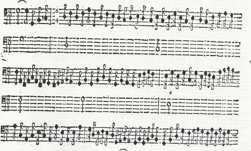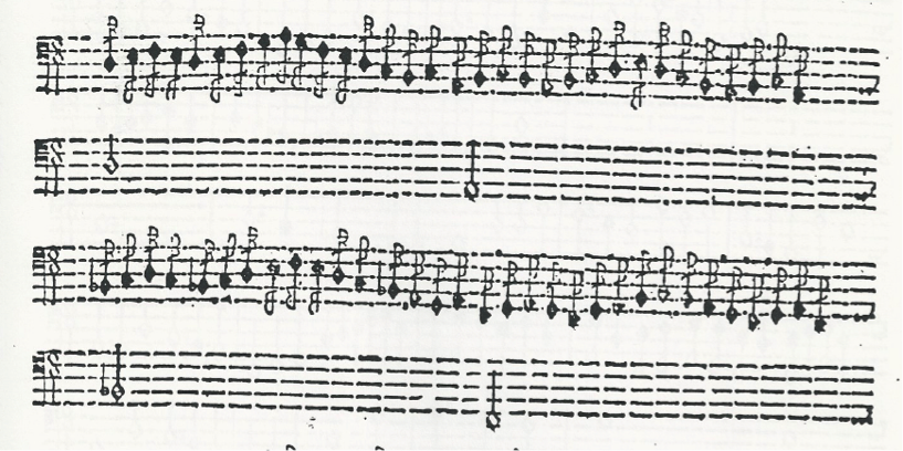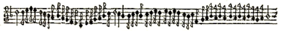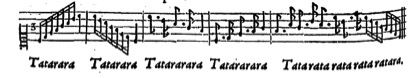 3. Single tonguing (no example given). Mersenne describes it as “done with the tongue alone, and serves for all kinds of notes except eight notes, for which the second manner just mentioned is used.”[5]